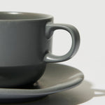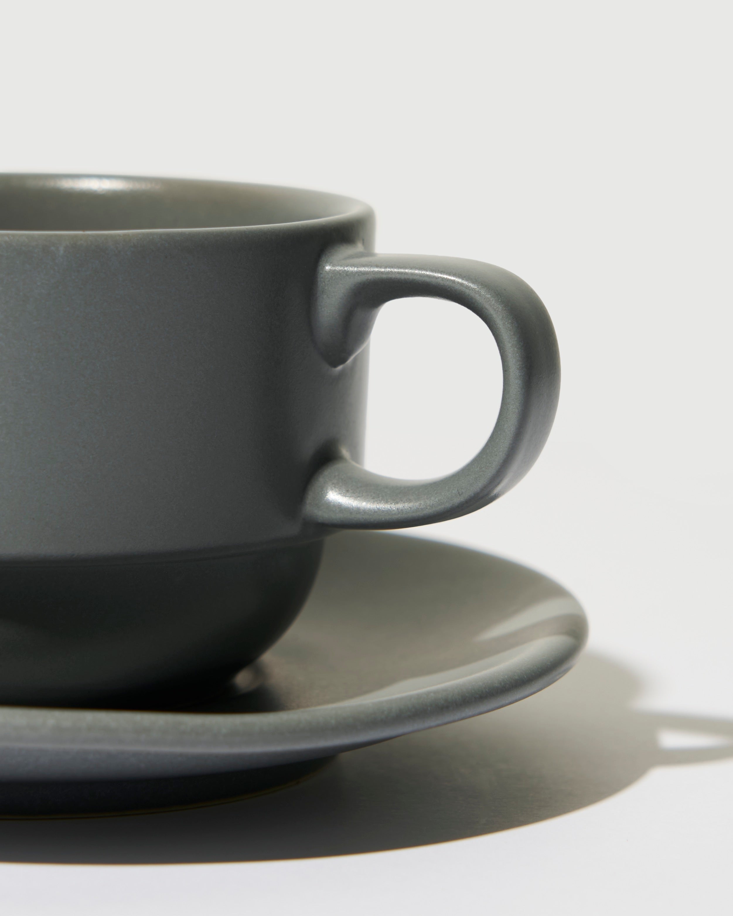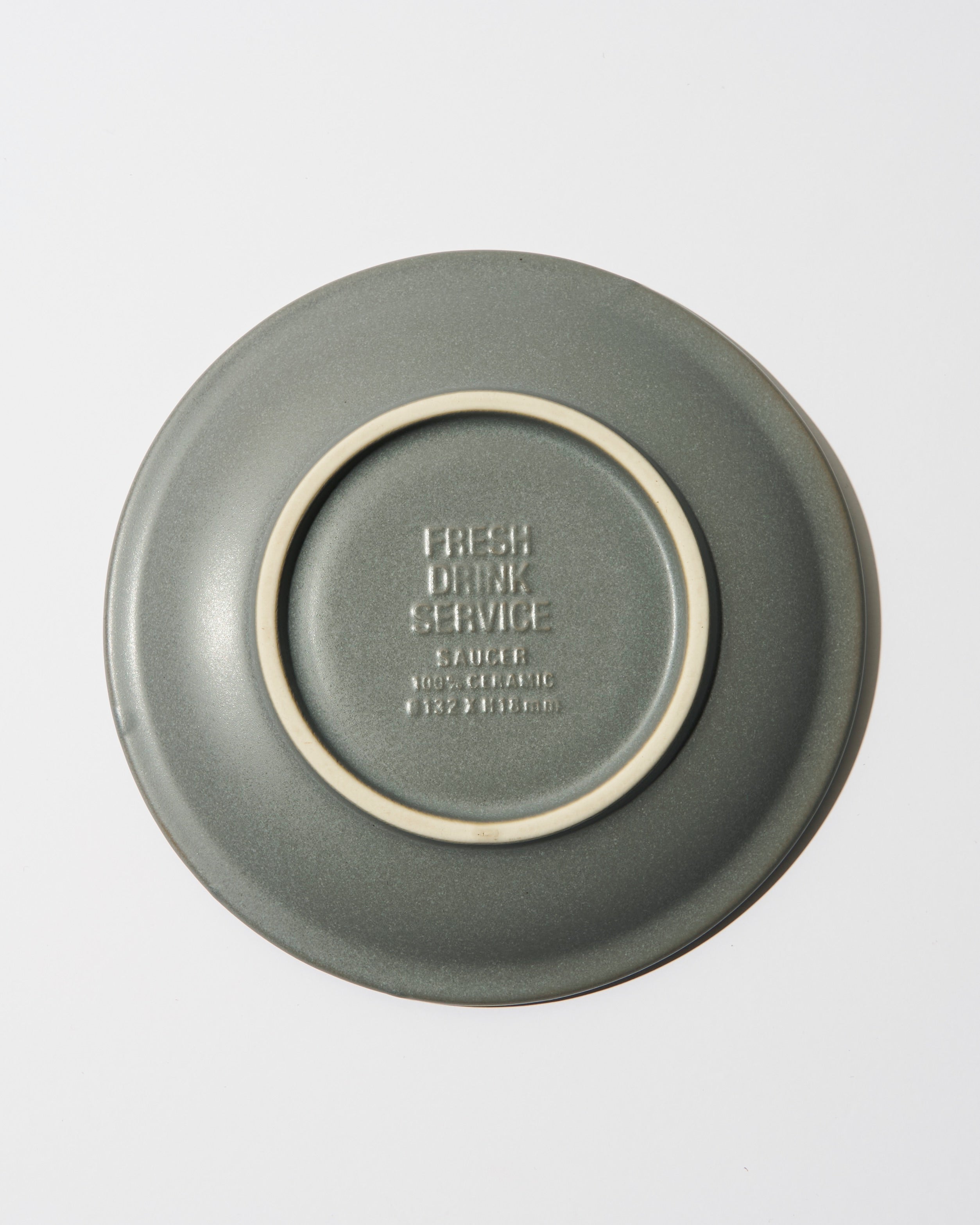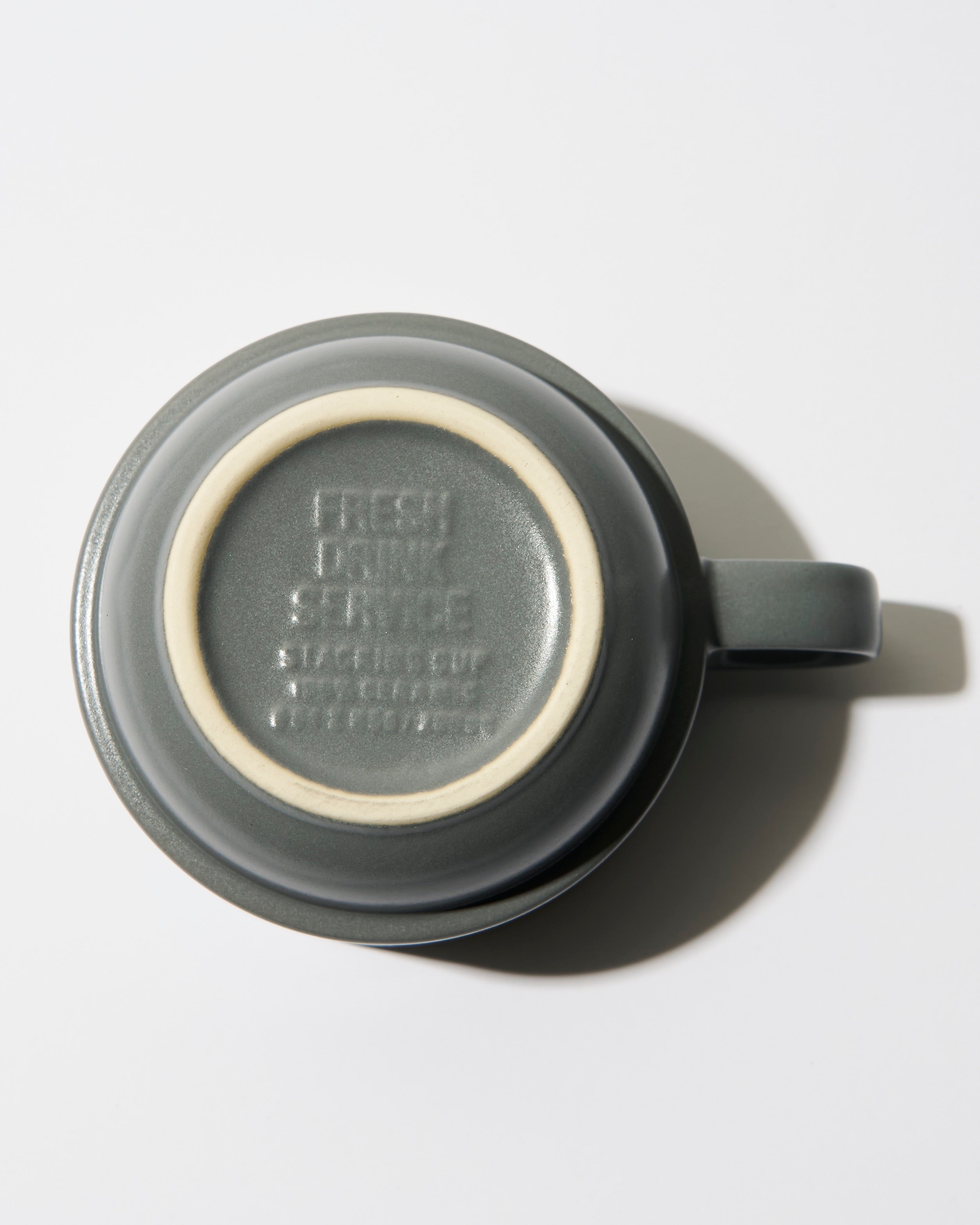 丸みを帯びたシルエットに、マットなグレーカラーが柔らかく洗練された印象を添えるカップ&ソーサー。手仕事による微妙な表情の違いも魅力。背面にはさりげなく「FRESH DRINK SERVICE」のロゴ入り。カップの容量は200ml。