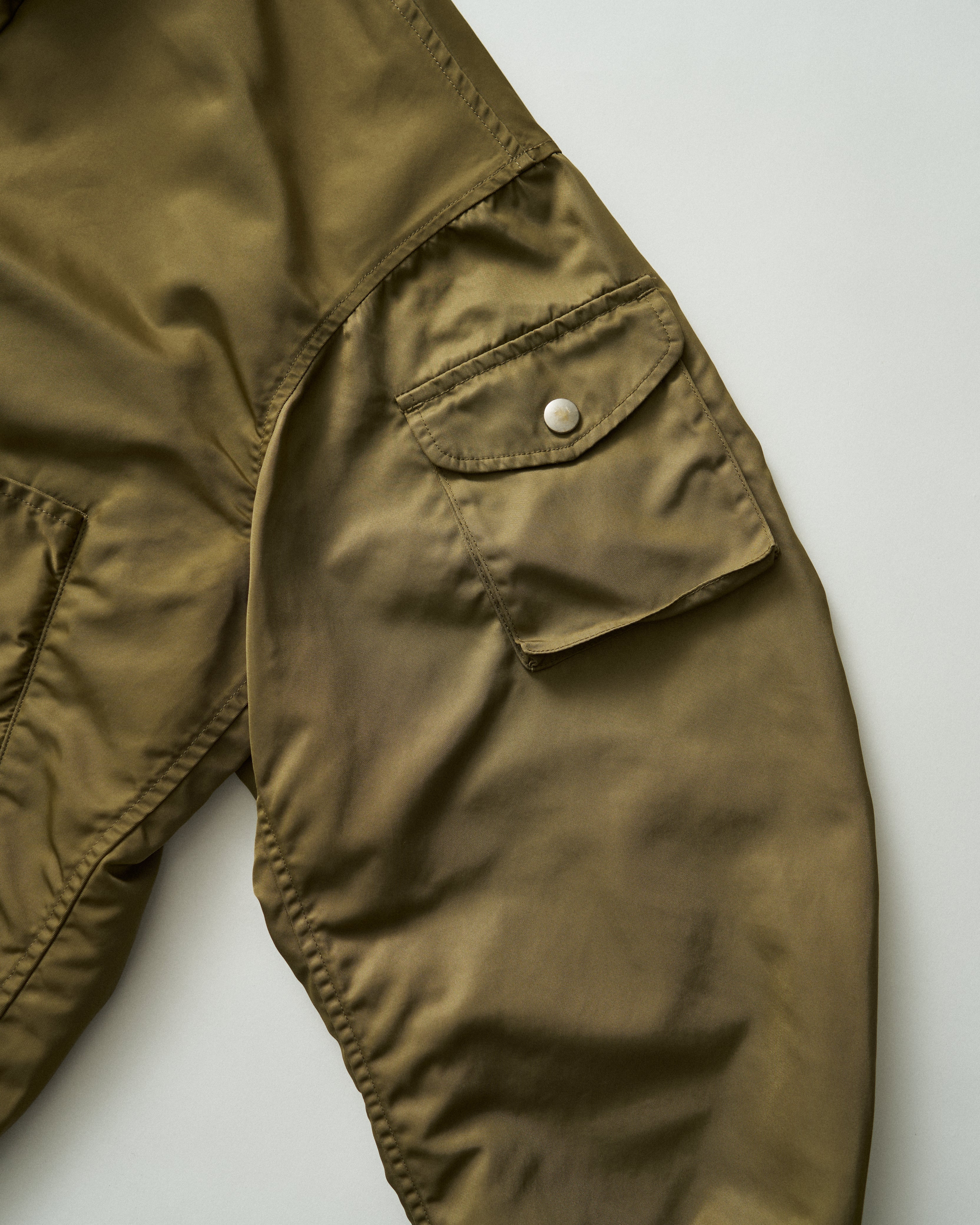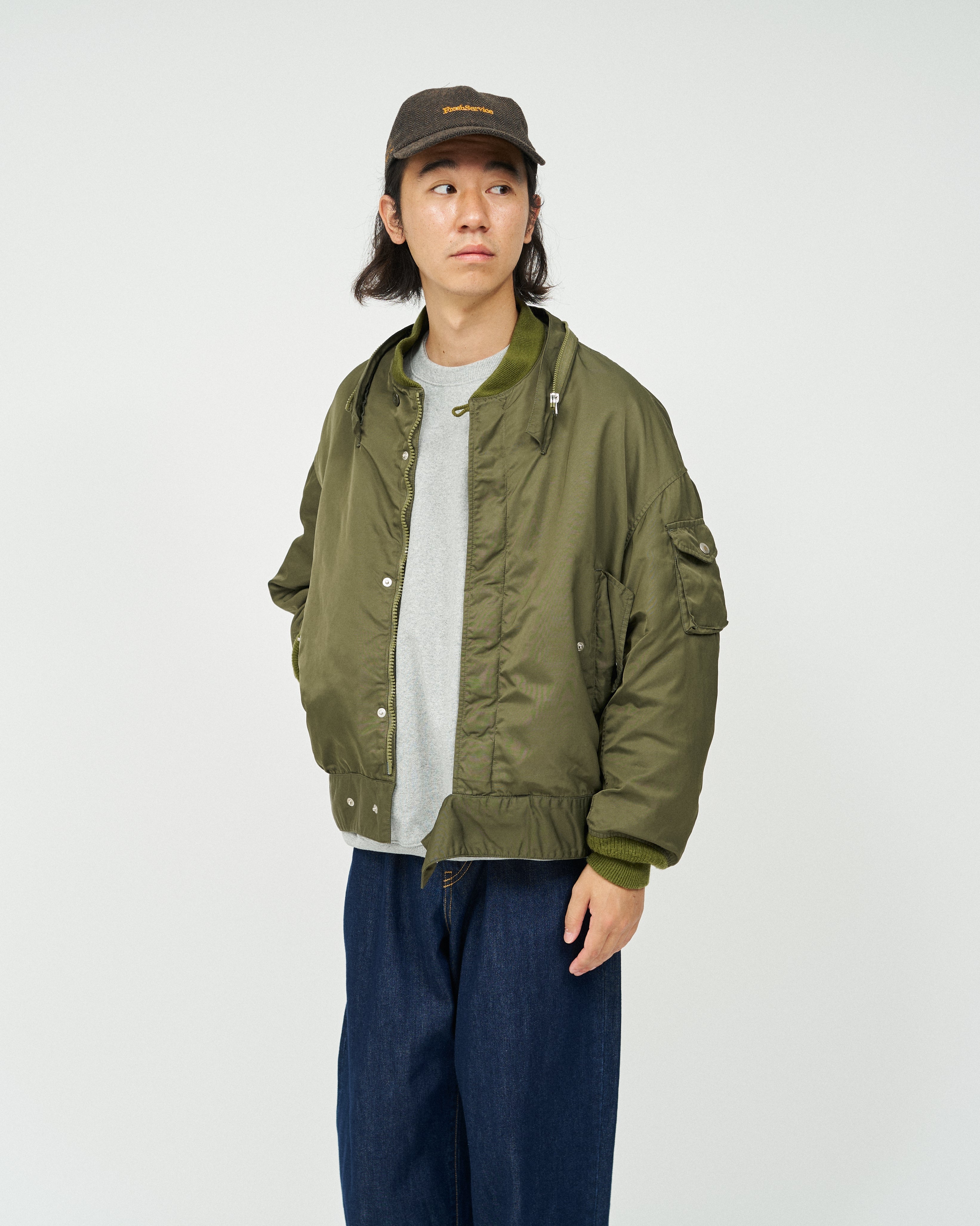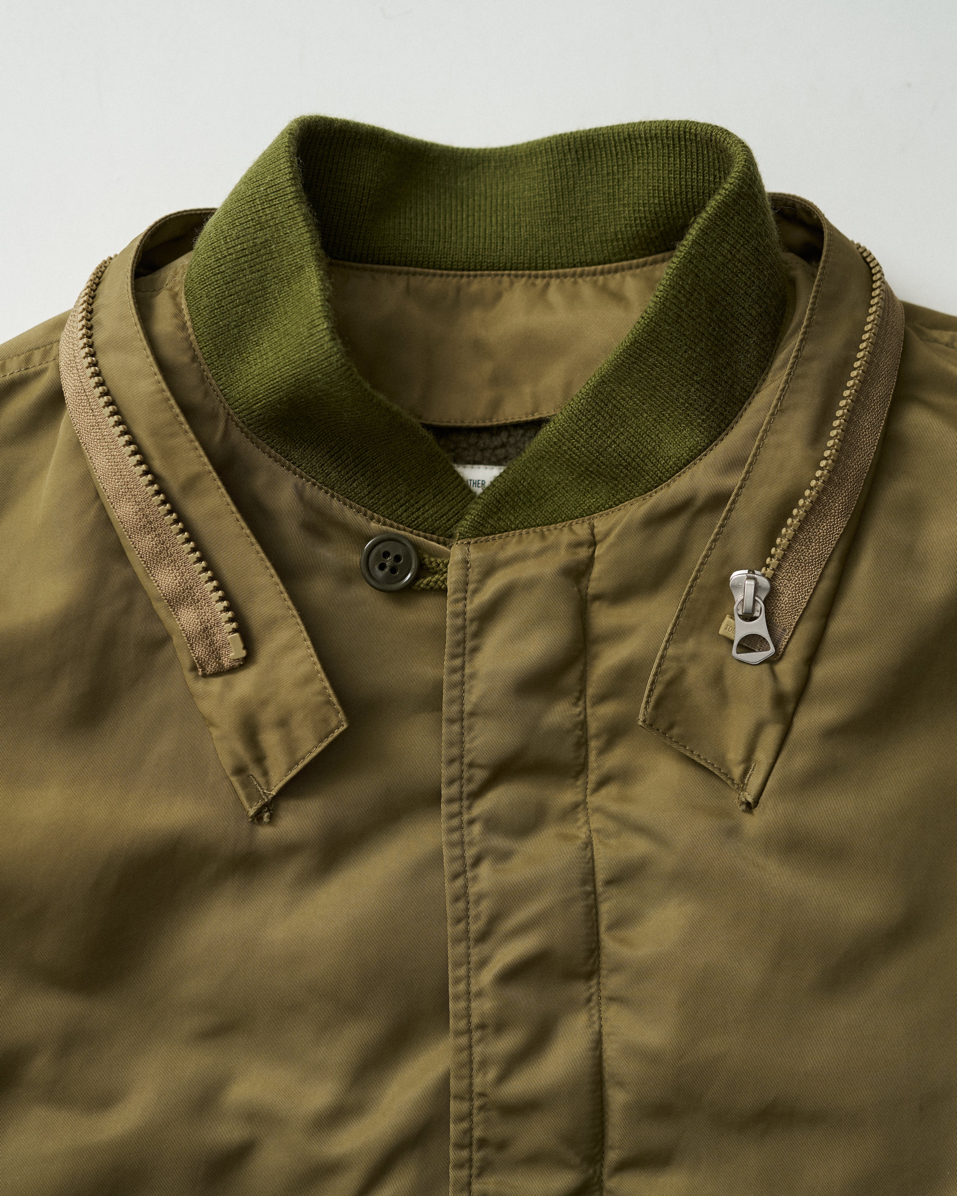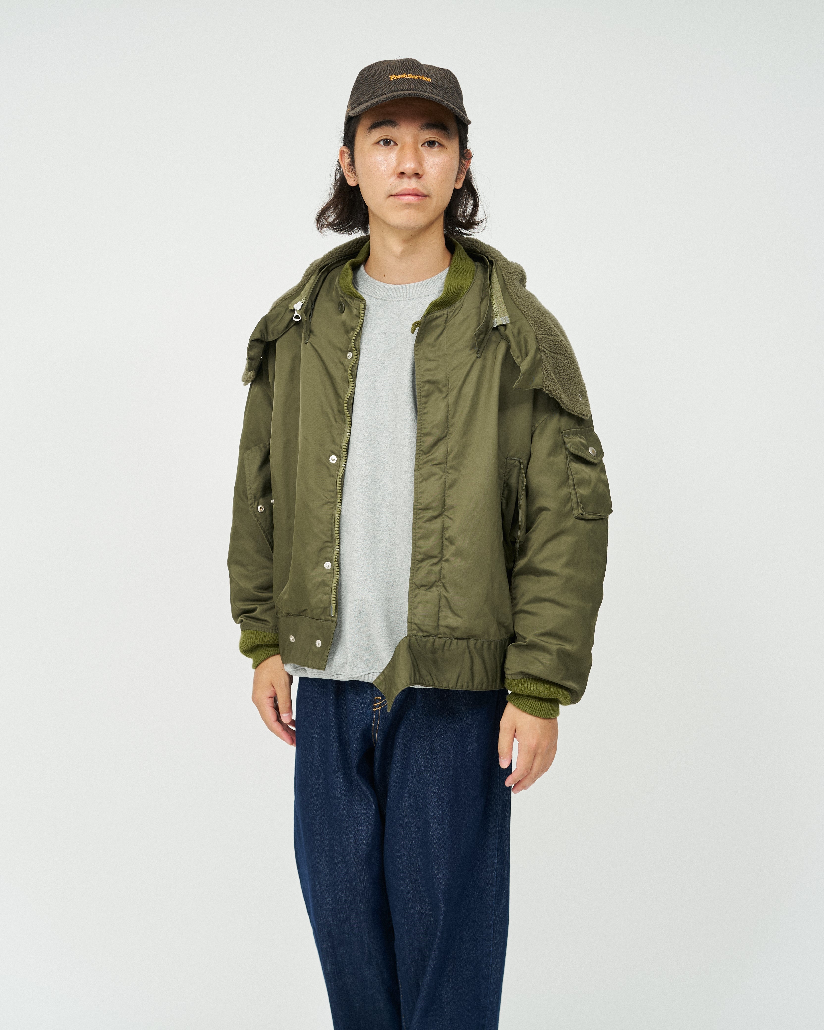 往年のU.S.デッキジャケットをモチーフに、ドロップショルダーでゆったりとしたシルエットへと再構築した一着。タフな生地感に長年着込んだような風合いを表現する加工を施し、当時のディテールを現代的に再現しています。フードとライニングはどちらも着脱可能で、季節やスタイルに応じてアレンジが可能。表地には耐久性の高いフライトナイロンツイルを用い、ライニングにはボリューム感のあるボアフリースを採用しています。ライニングは単体でも着用できるため、幅広いシーンで活躍し、長いシーズンを通して楽しめる仕様です。