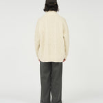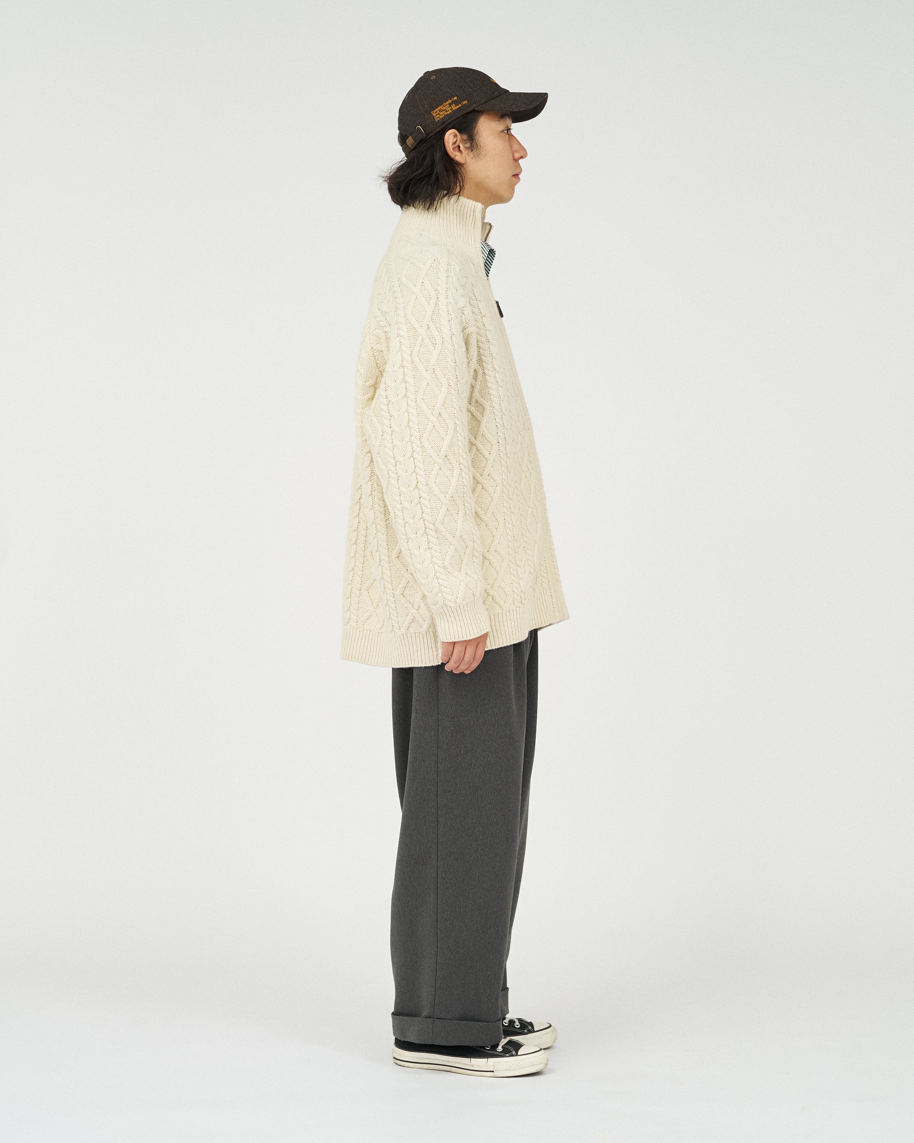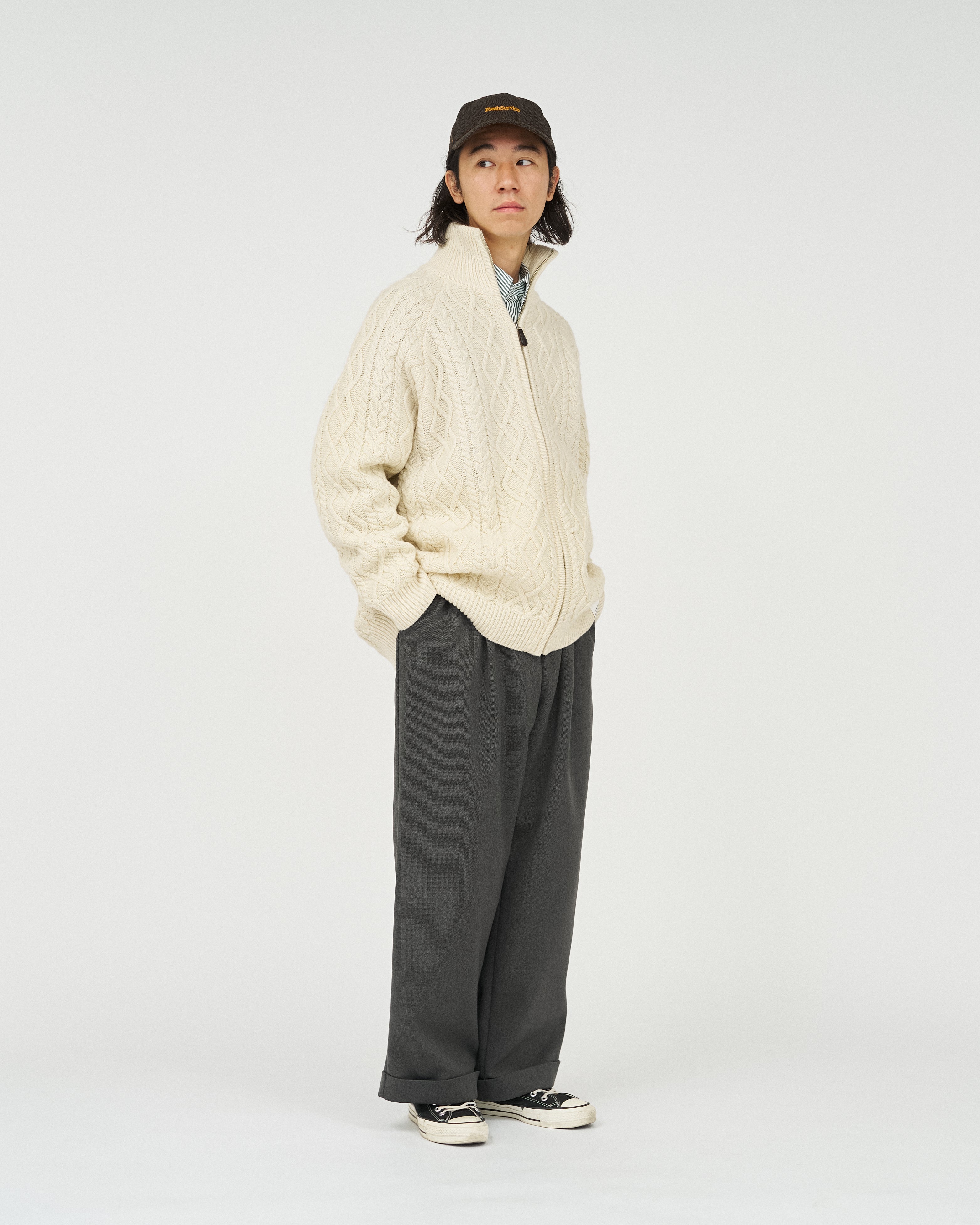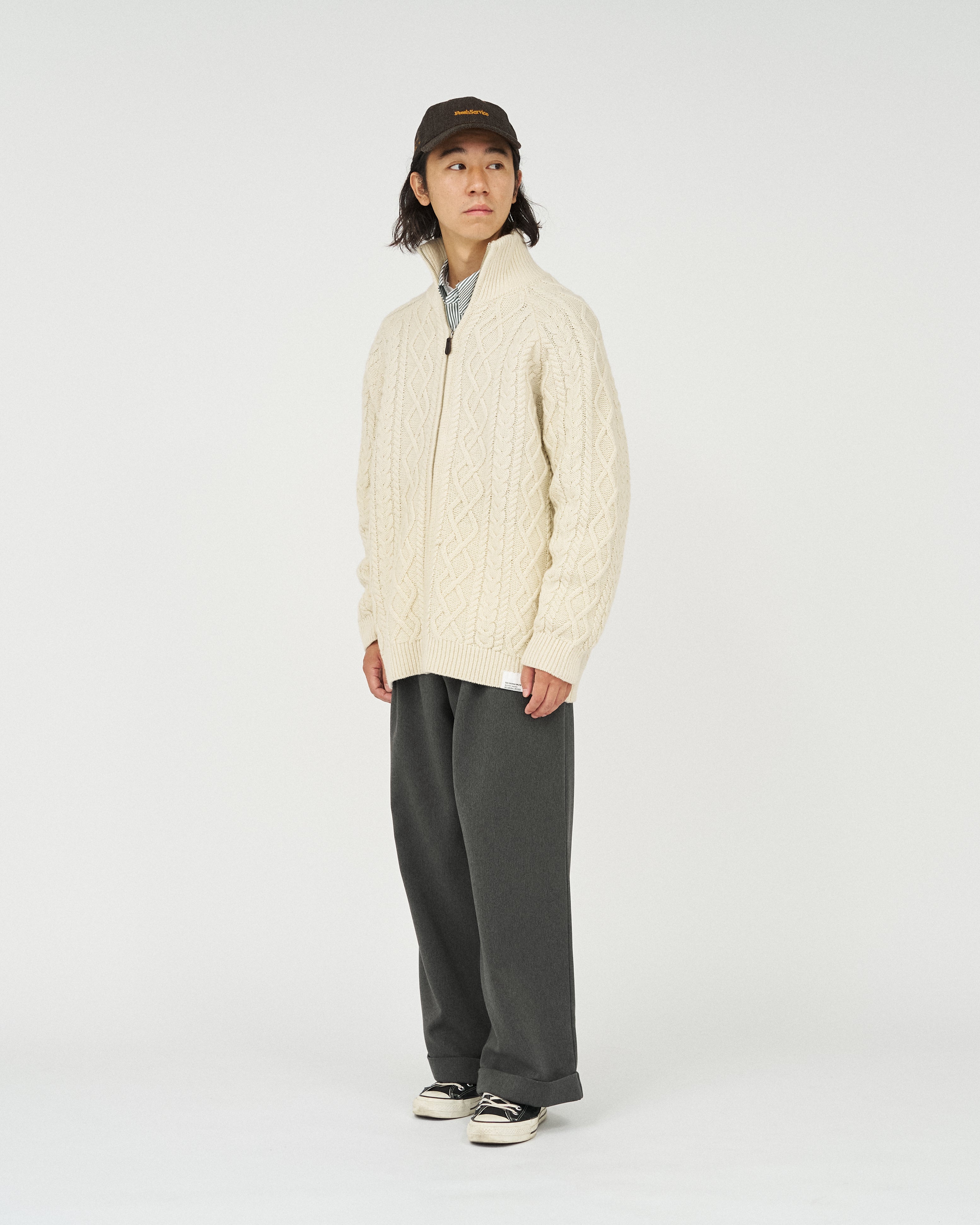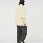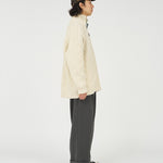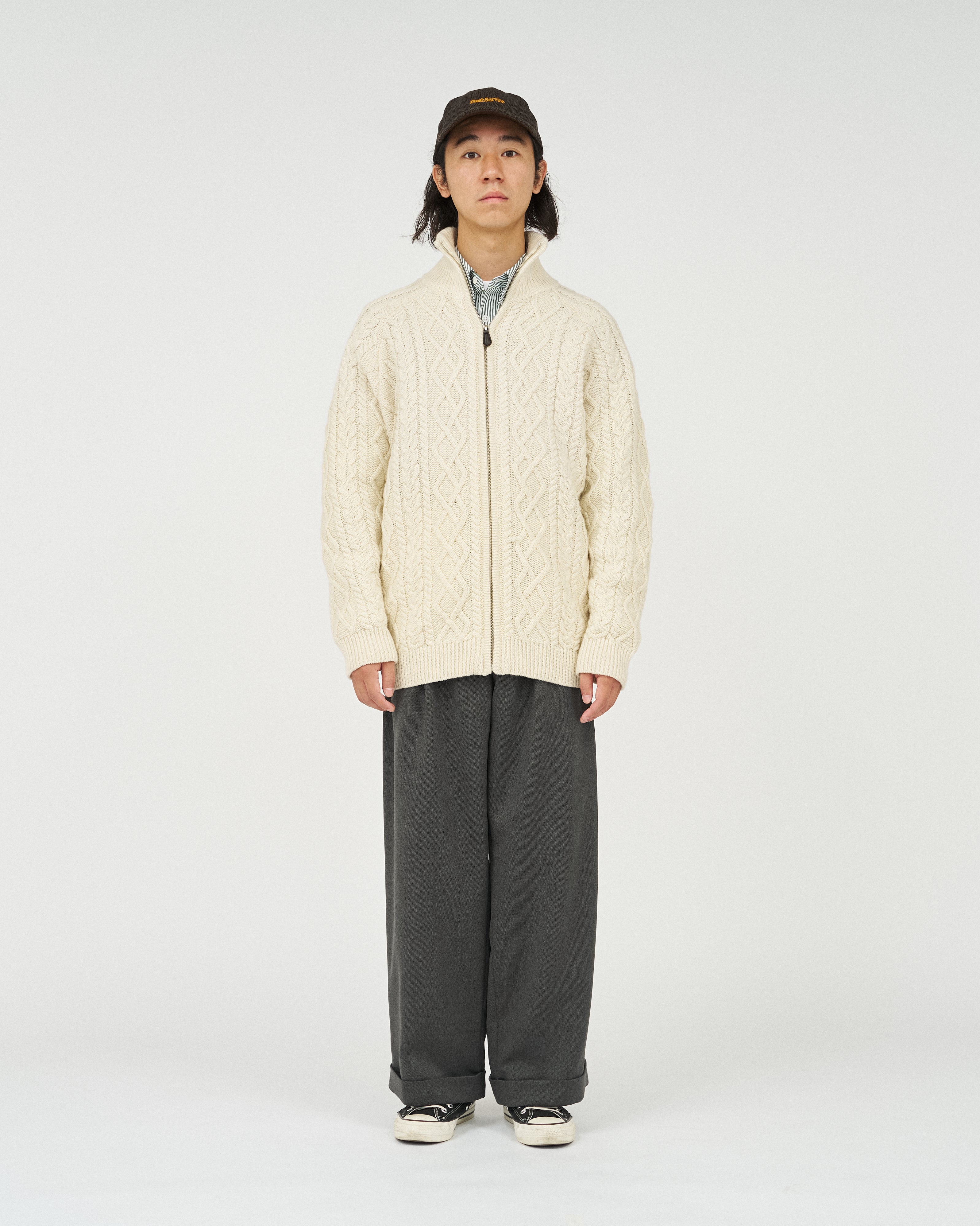 現代的にアップデートした、伝統的なアラン編のフィッシャーマンセーター。素材本来の風合いを活かしながら伸縮性や形態安定性を付与することができるSOLOTEX糸は、一部に植物由来原料を使用しており、地球環境にも配慮した素材です。そのSOLOTEX糸でシェットランドウールをカバーリングすることで、ウール本来の暖かさみのある風合いはそのままに機能性を持たせたハイブリットな一着に仕上げました。FreshServiceらしいゆとりのあるシルエットのジップアップは、羽織としても中間レイヤーとしても活躍する汎用性の高い一枚です。
