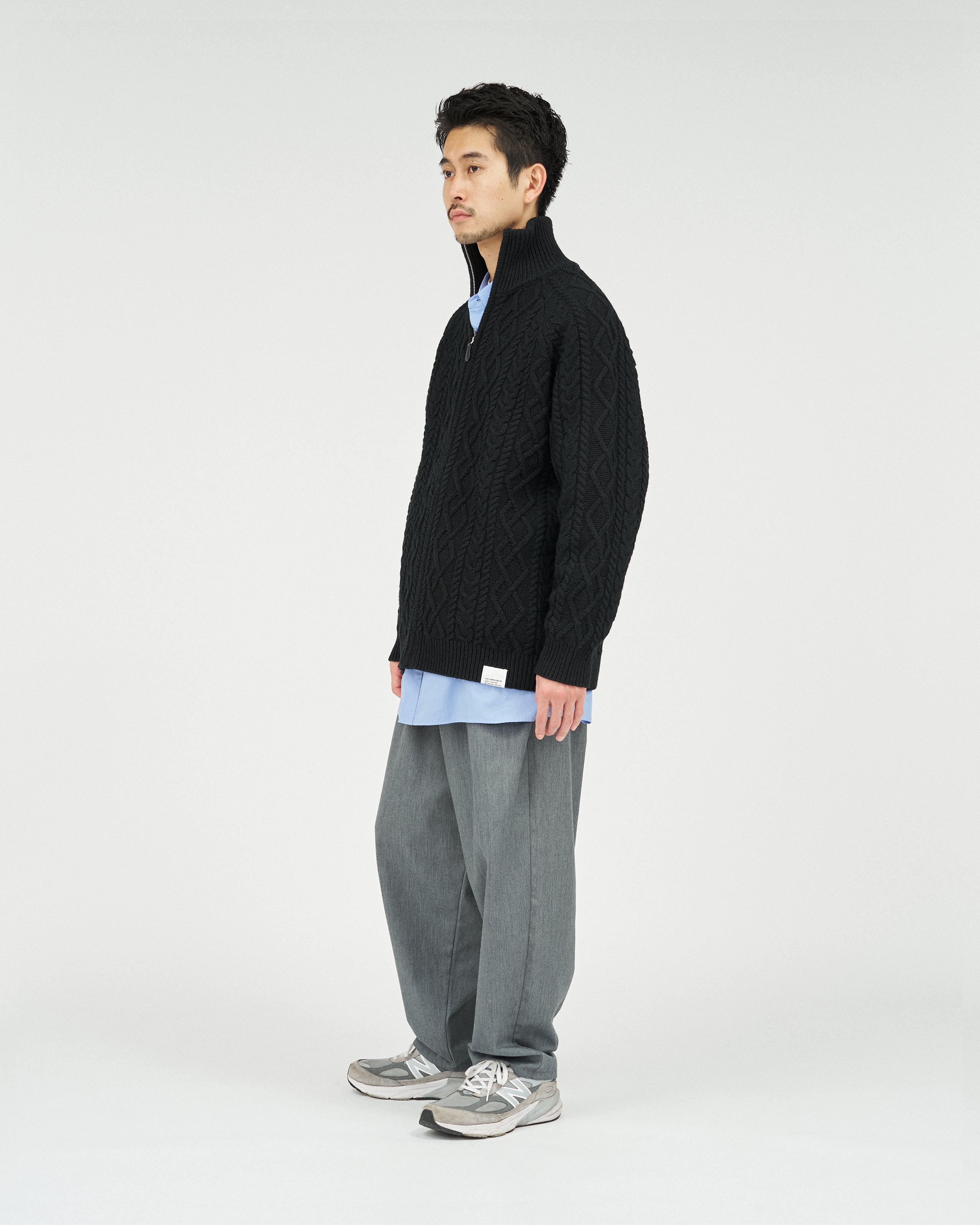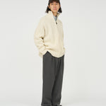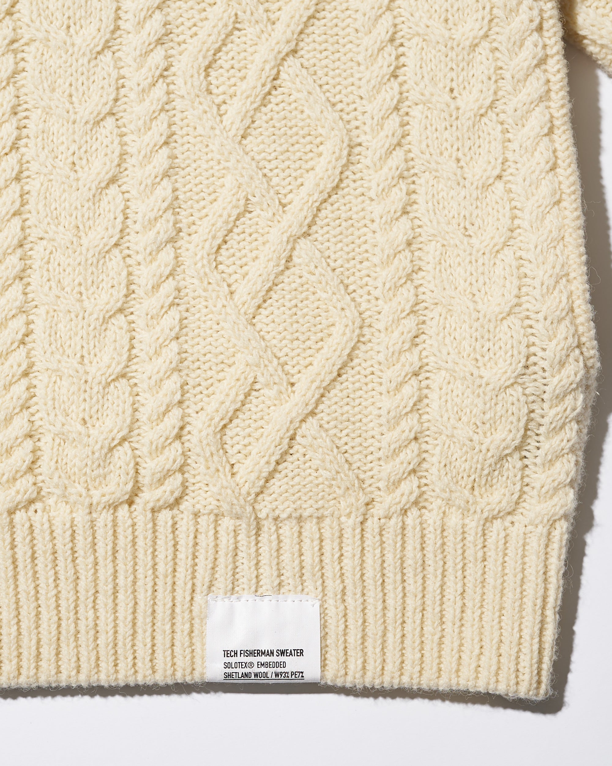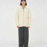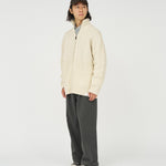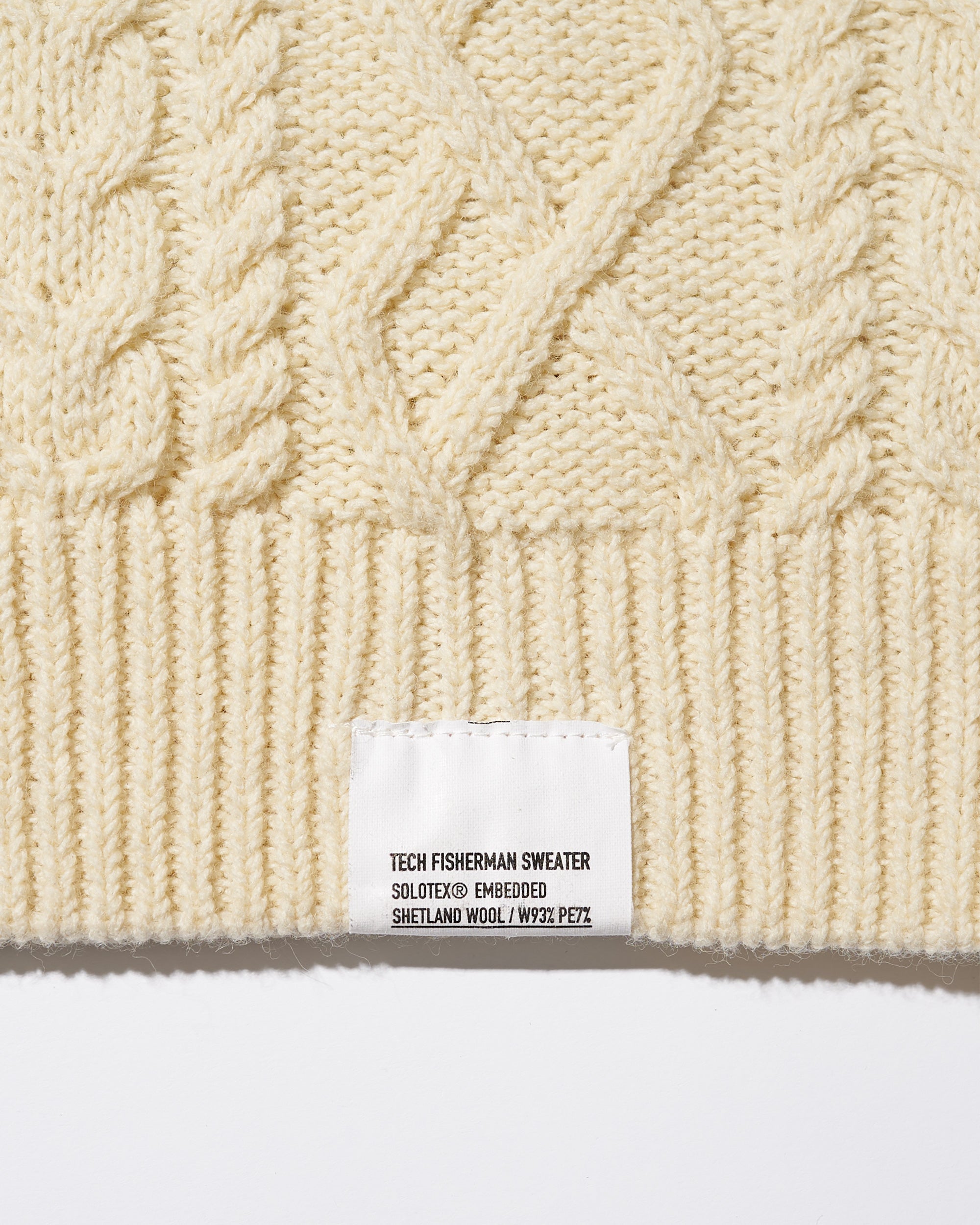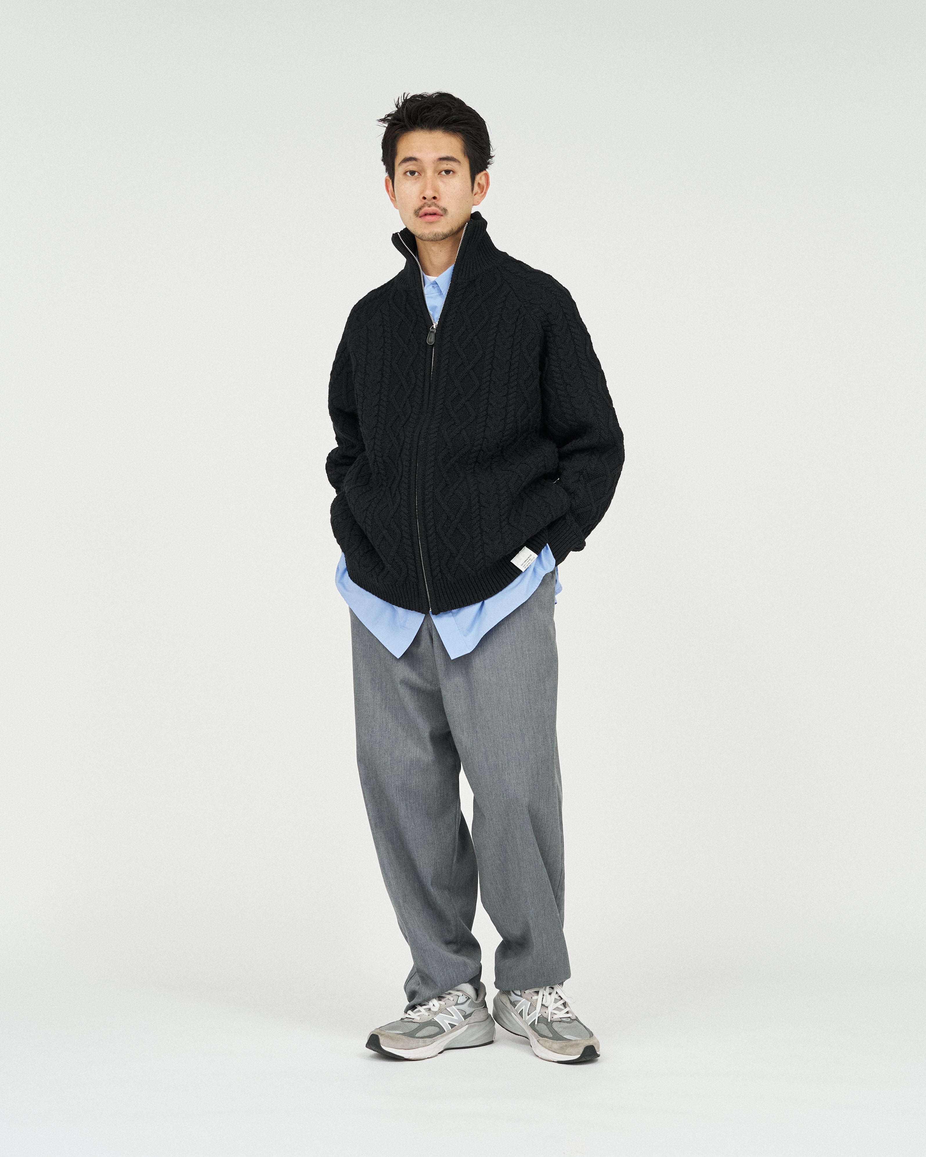 現代的にアップデートした、伝統的なアラン編のフィッシャーマンセーター。素材本来の風合いを活かしながら伸縮性や形態安定性を付与することができるSOLOTEX糸は、一部に植物由来原料を使用しており、地球環境にも配慮した素材です。そのSOLOTEX糸でシェットランドウールをカバーリングすることで、ウール本来の暖かさみのある風合いはそのままに機能性を持たせたハイブリットな一着に仕上げました。FreshServiceらしいゆとりのあるシルエットのジップアップは、羽織としても中間レイヤーとしても活躍する汎用性の高い一枚です。