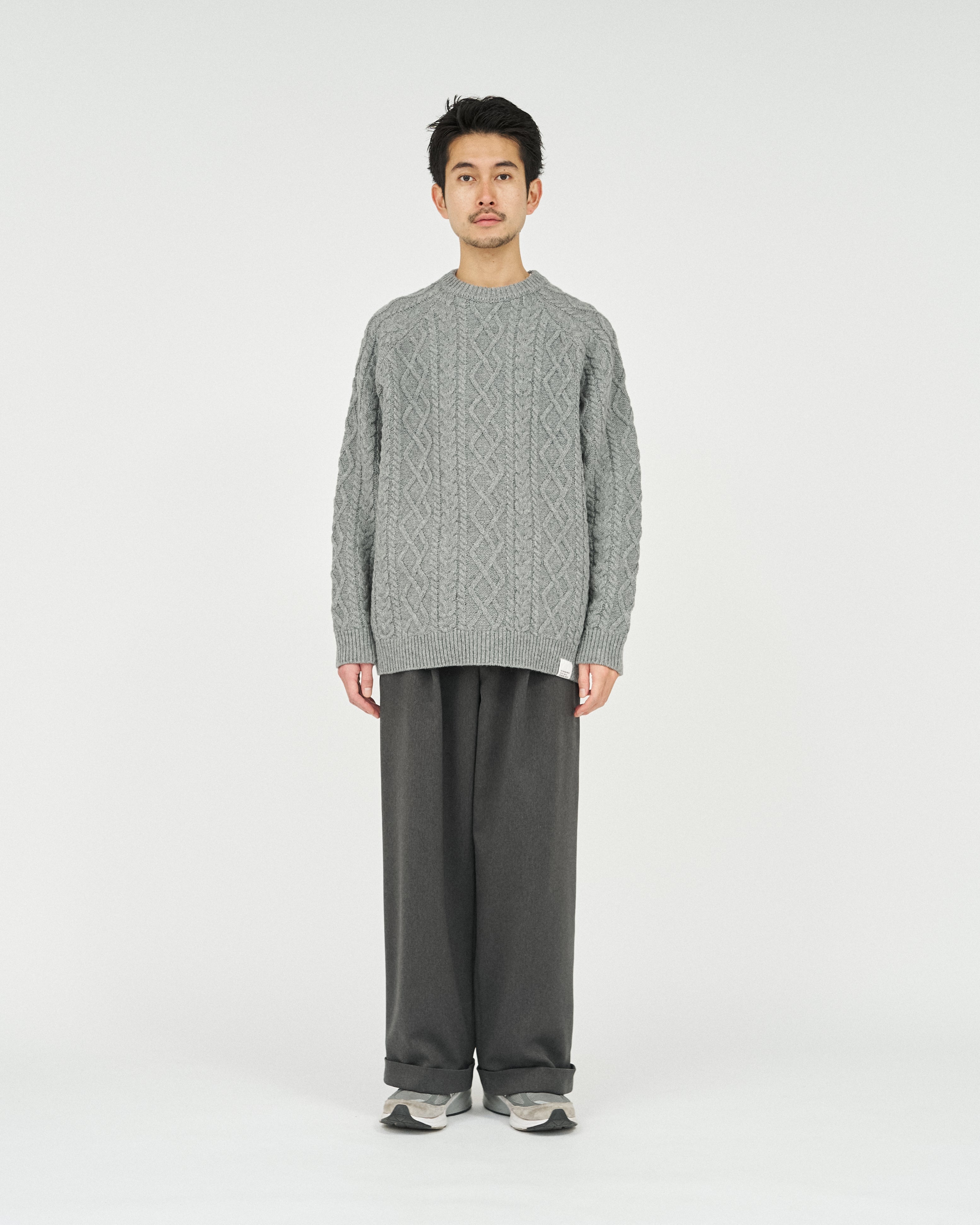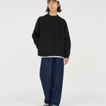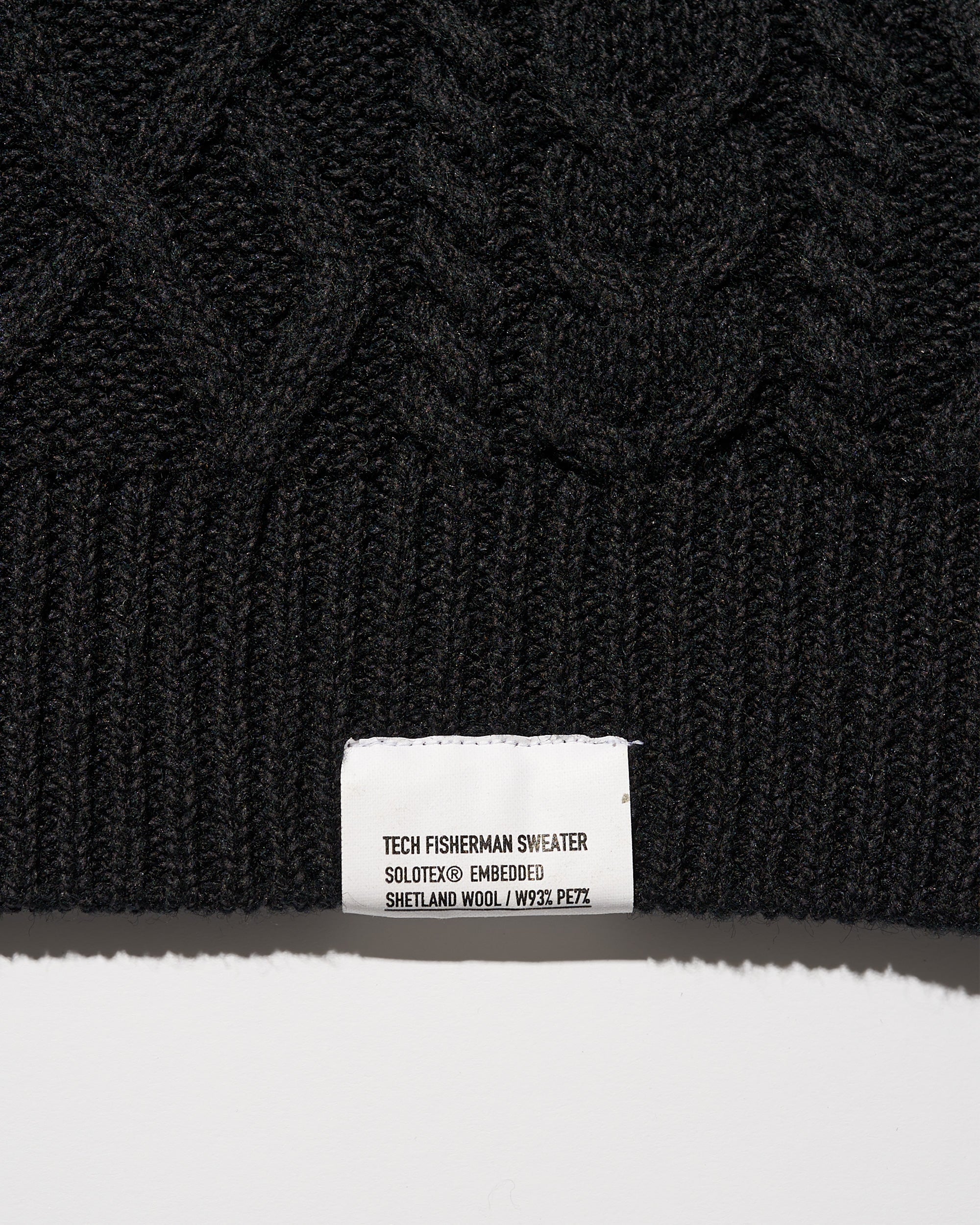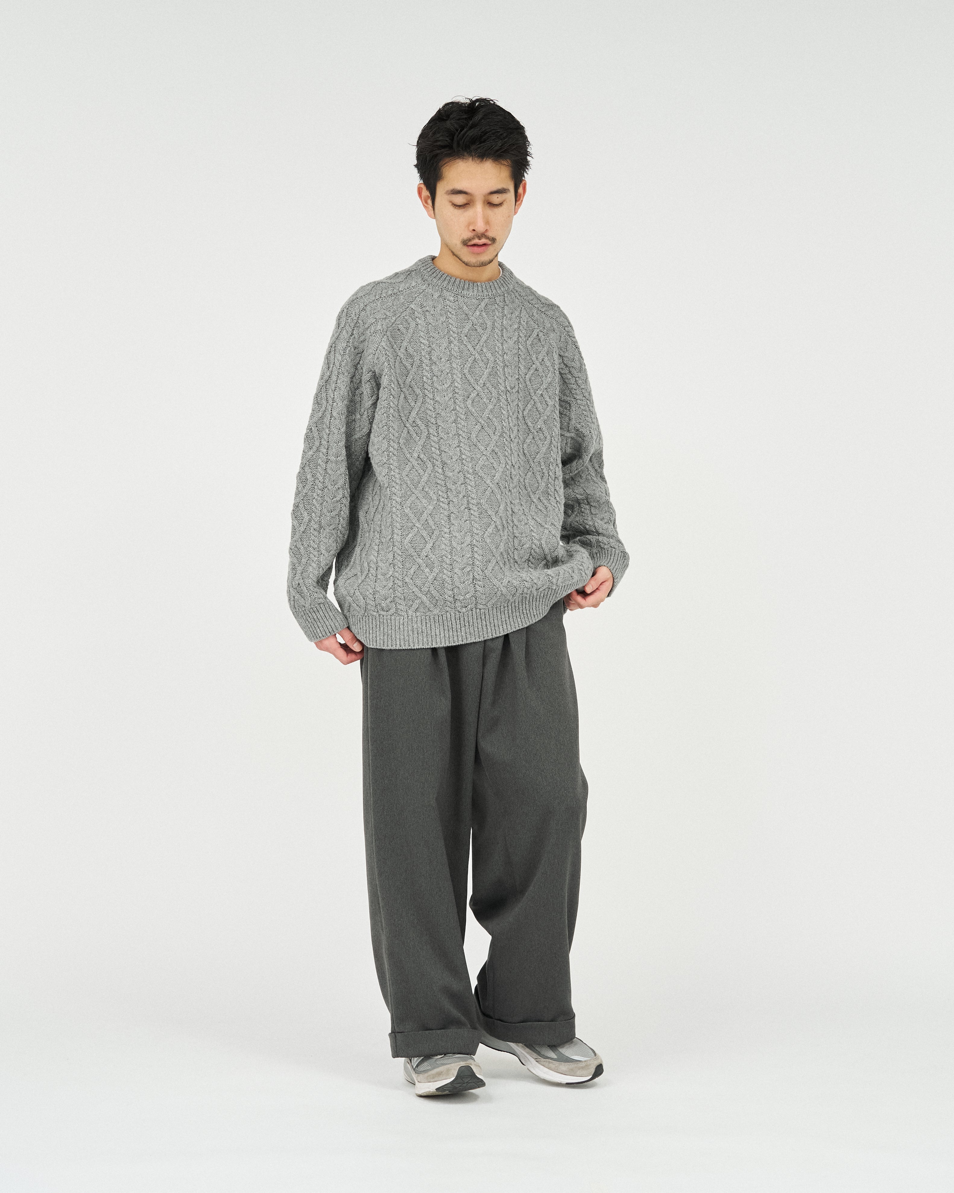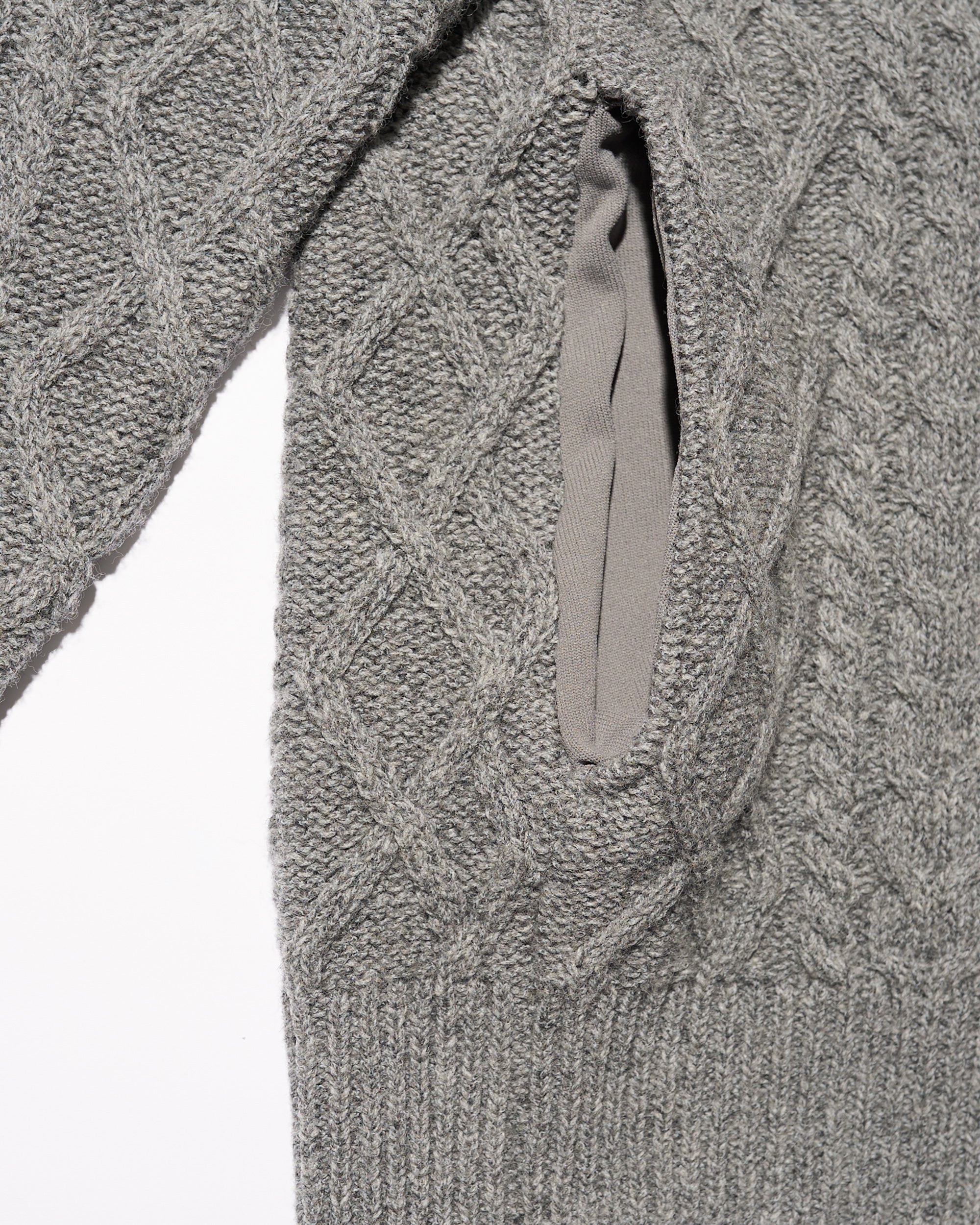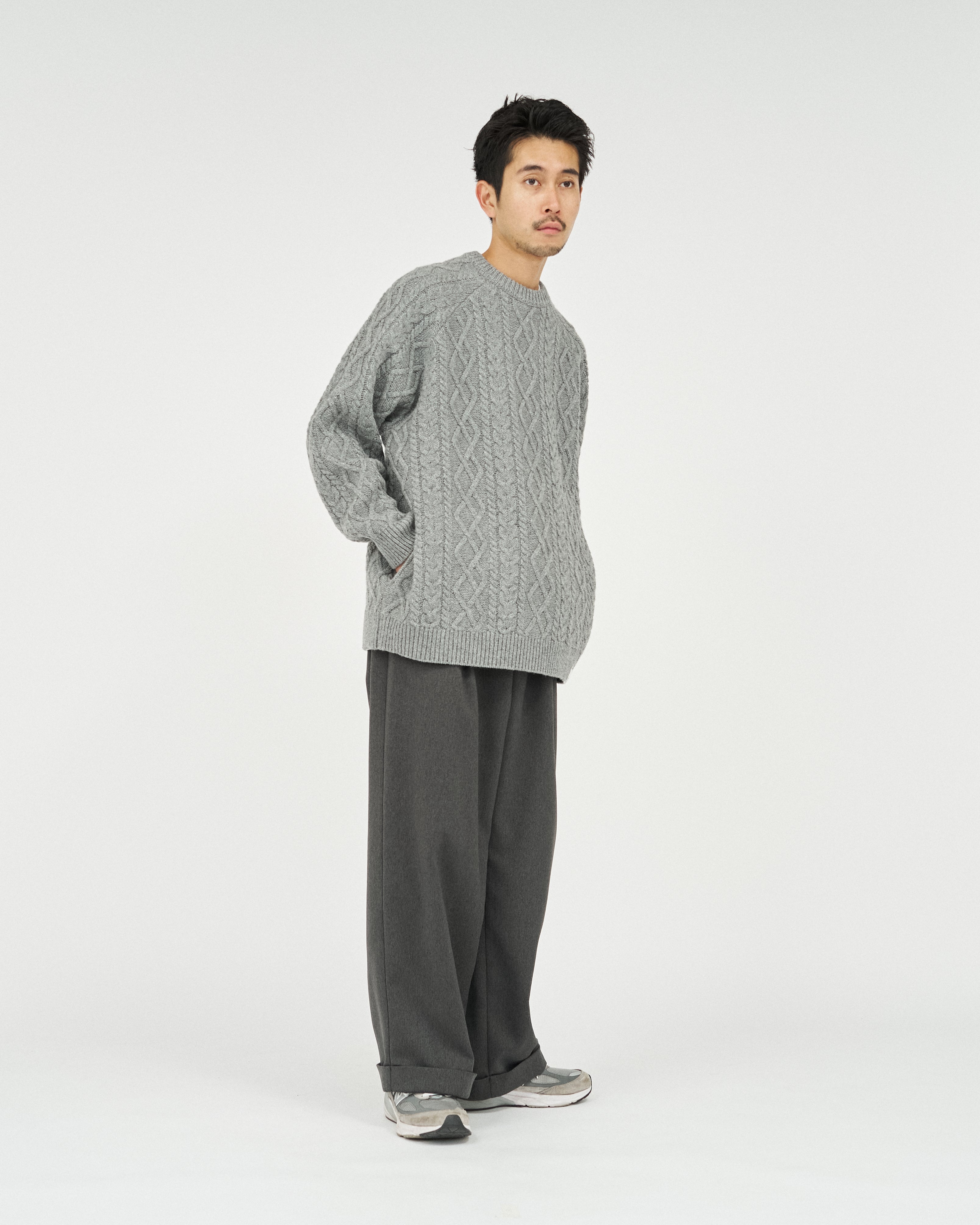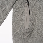 現代的にアップデートした、伝統的なアラン編のフィッシャーマンセーター。素材本来の風合いを活かしながら伸縮性や形態安定性を付与することができるSOLOTEX糸は、一部に植物由来原料を使用しており、地球環境にも配慮した素材です。そのSOLOTEX糸でシェットランドウールをカバーリングすることで、ウール本来の暖かさみのある風合いはそのままに機能性を持たせたハイブリットな一着に仕上げました。ゆとりのあるシルエットで、サイドには大きめのシームポケットを配置。クラシックな面持ちながら遊び心と機能性を兼ね備えた一枚です。
