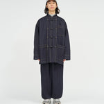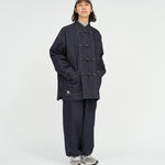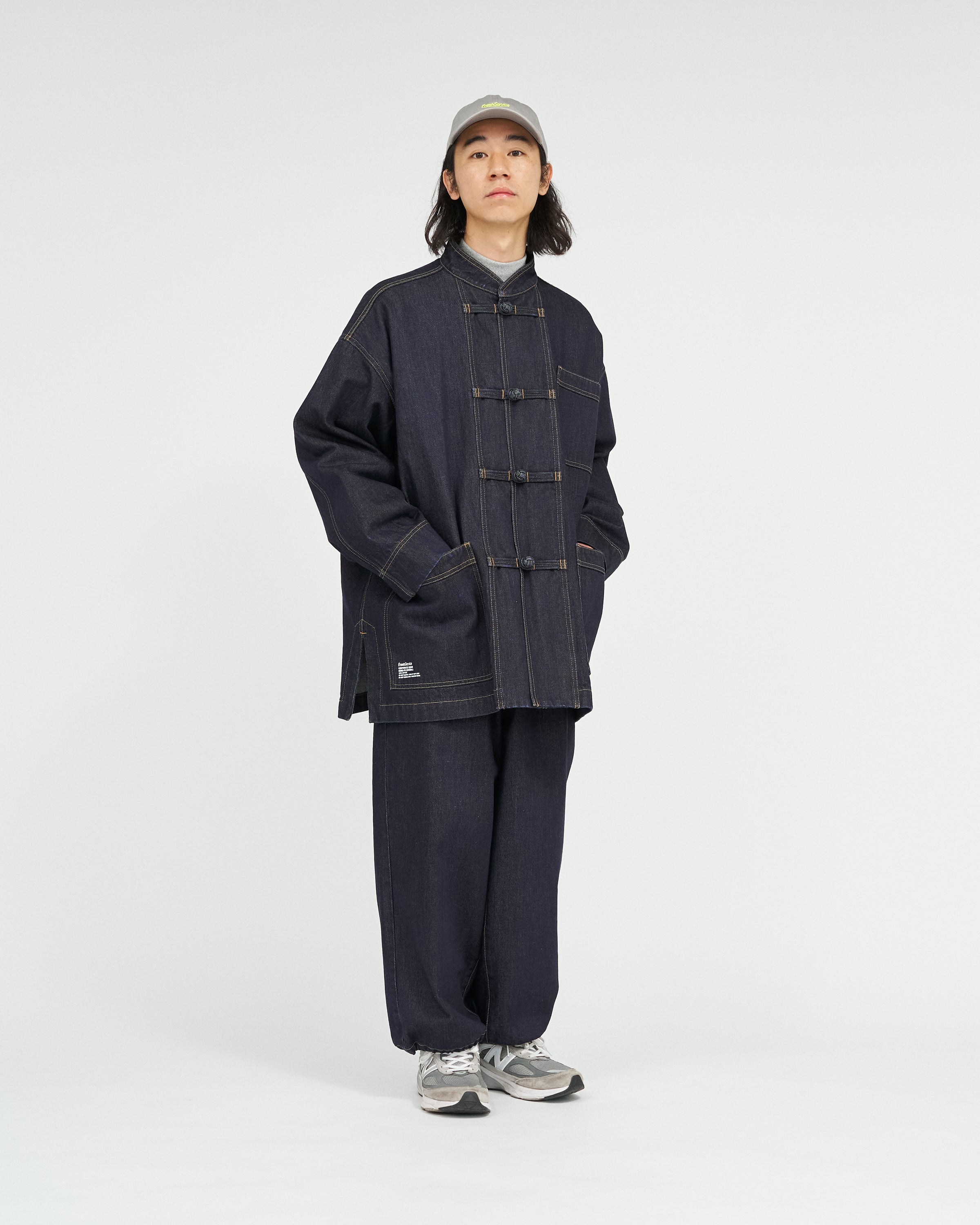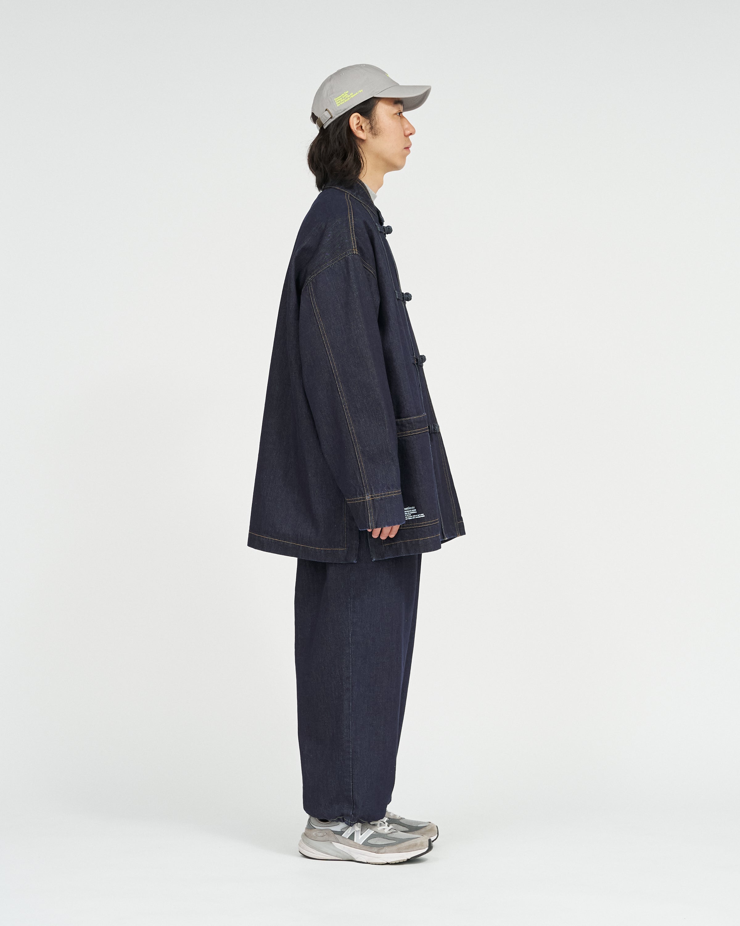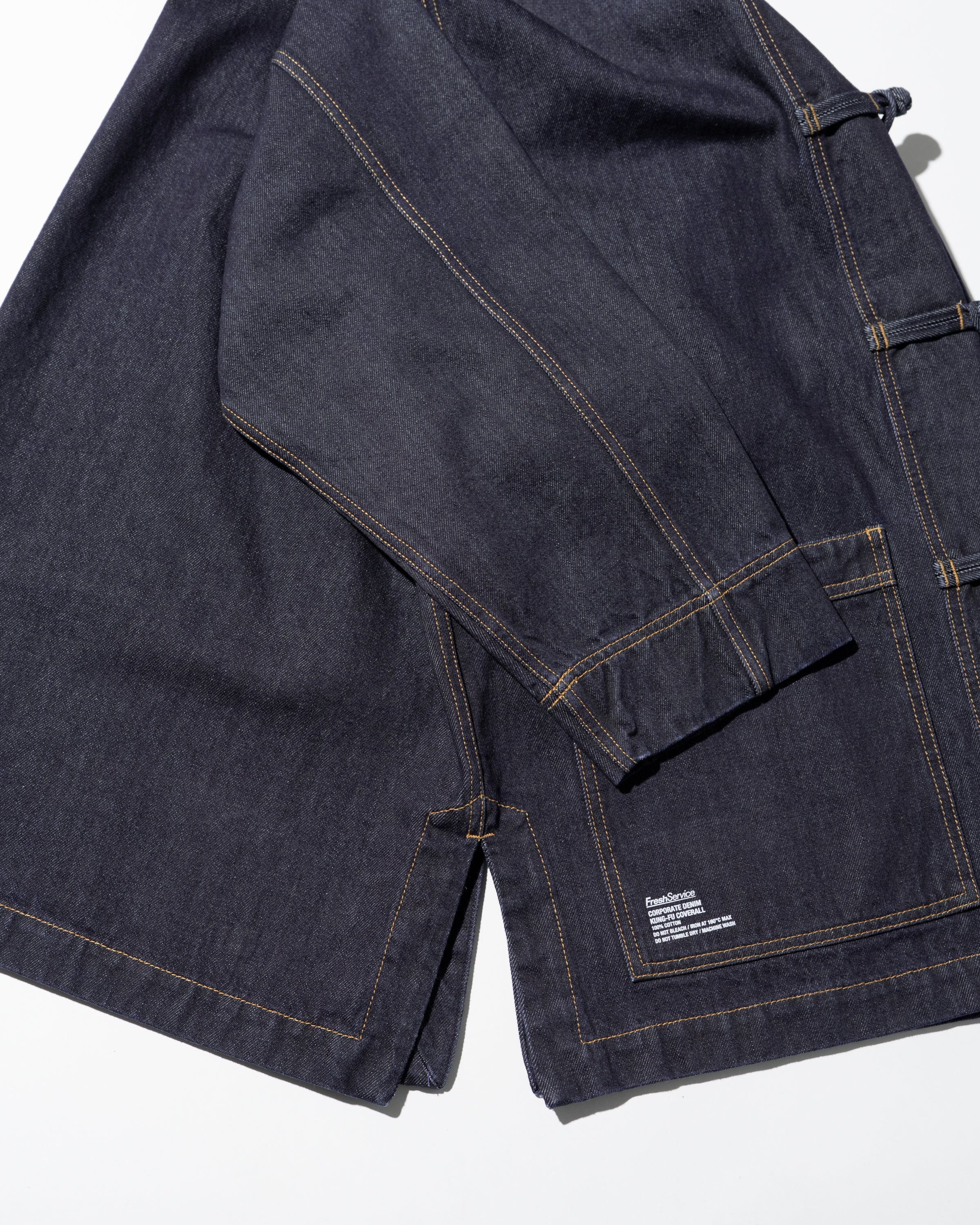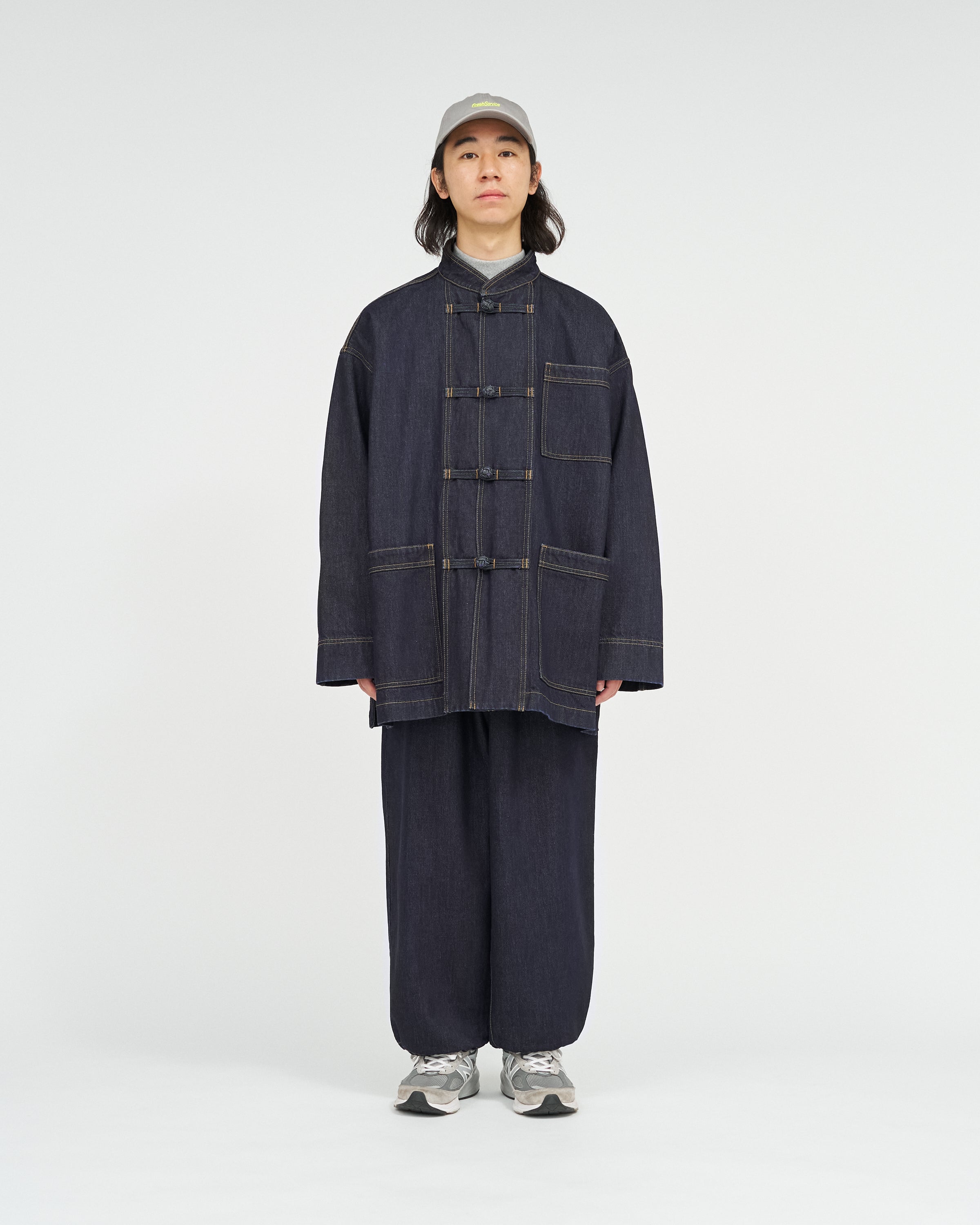 13.5ozのタフなデニムを採用したカバーオールは、ゆったりとしたドロップショルダーのシルエットに、フロントのチャイナボタンがアクセント。着込むほどに表情が深まり、ヴィンテージのようなフェードも楽しめる。同素材で展開されるCORPORATE DENIM EASY PANTS とのセットアップもおすすめ。