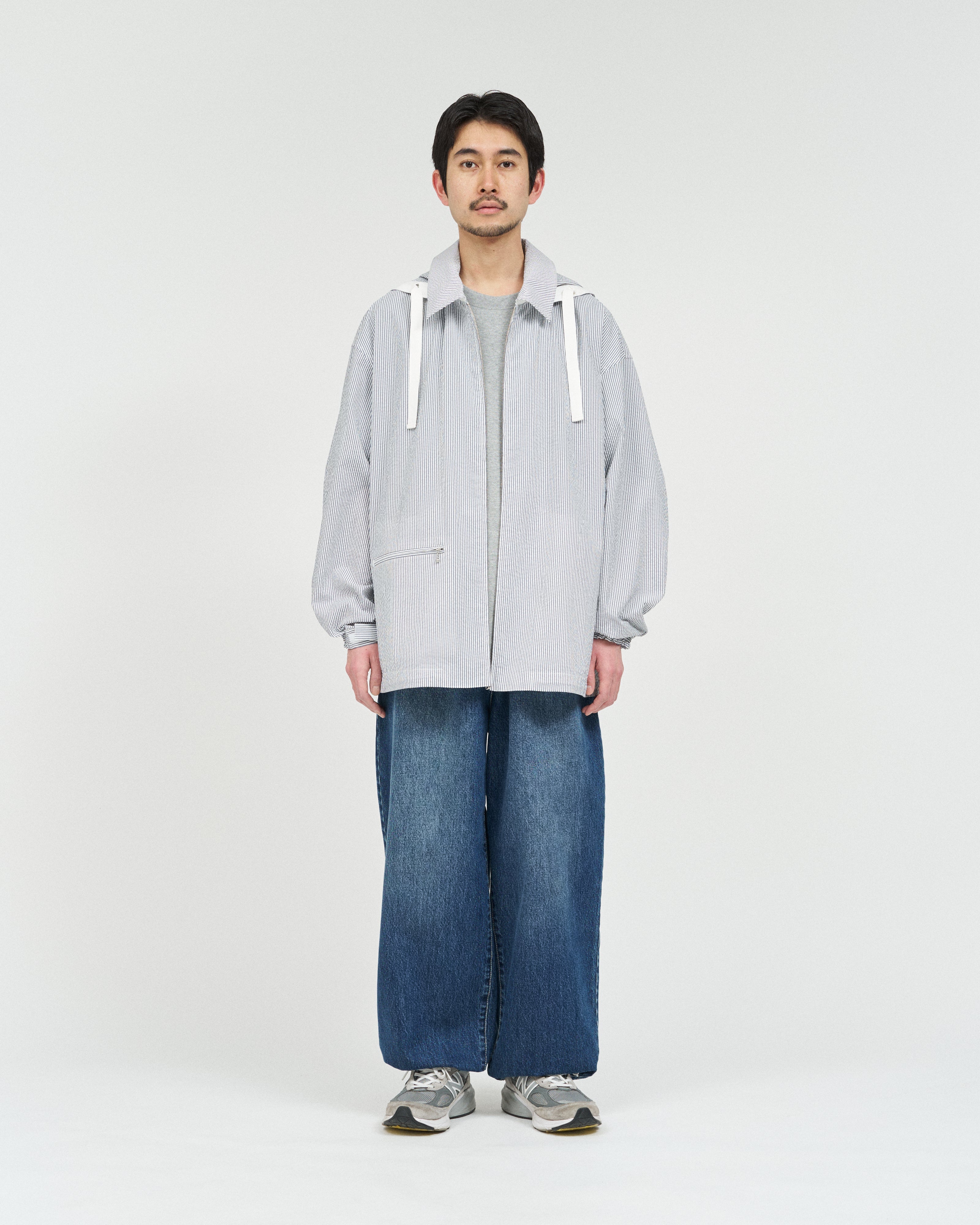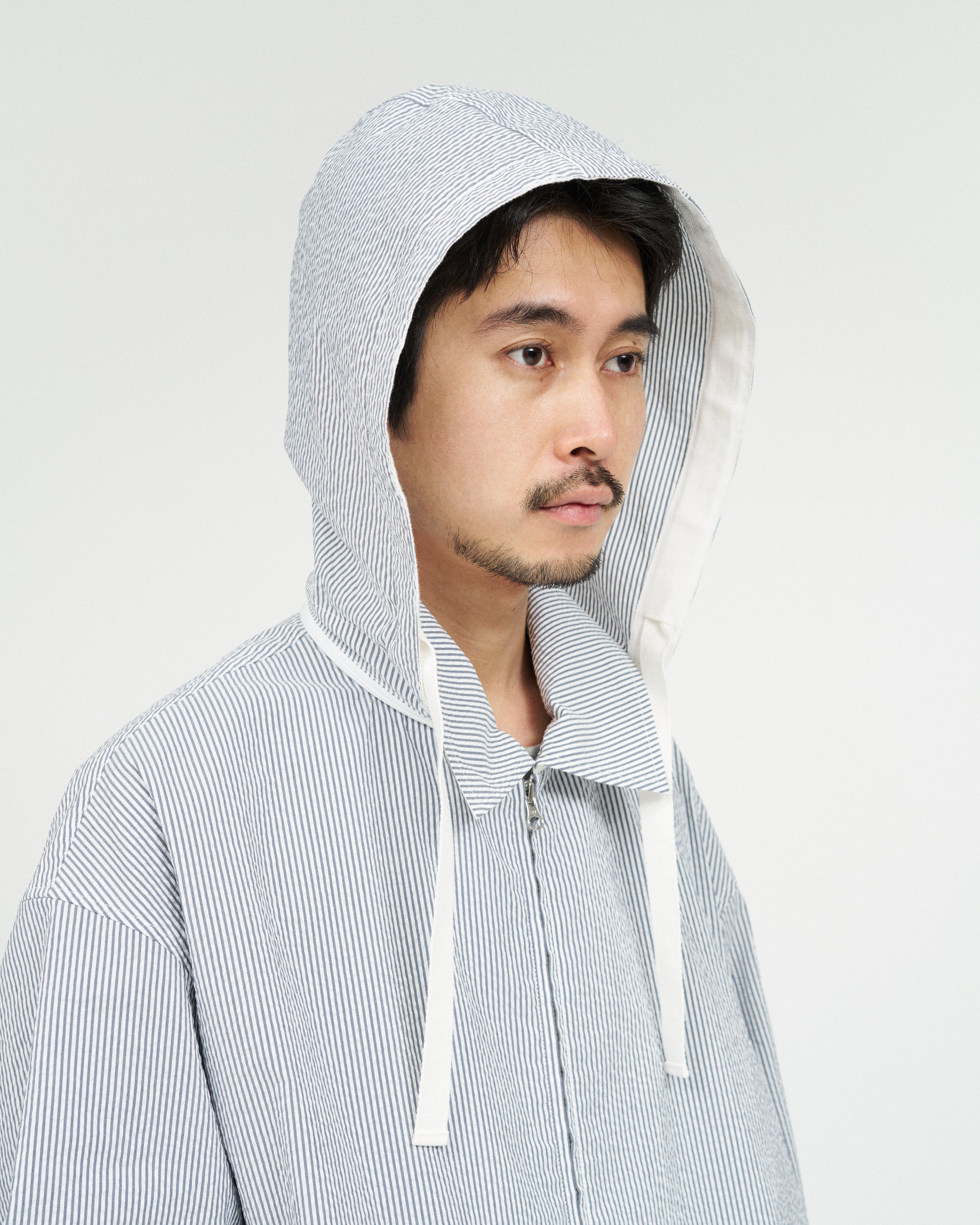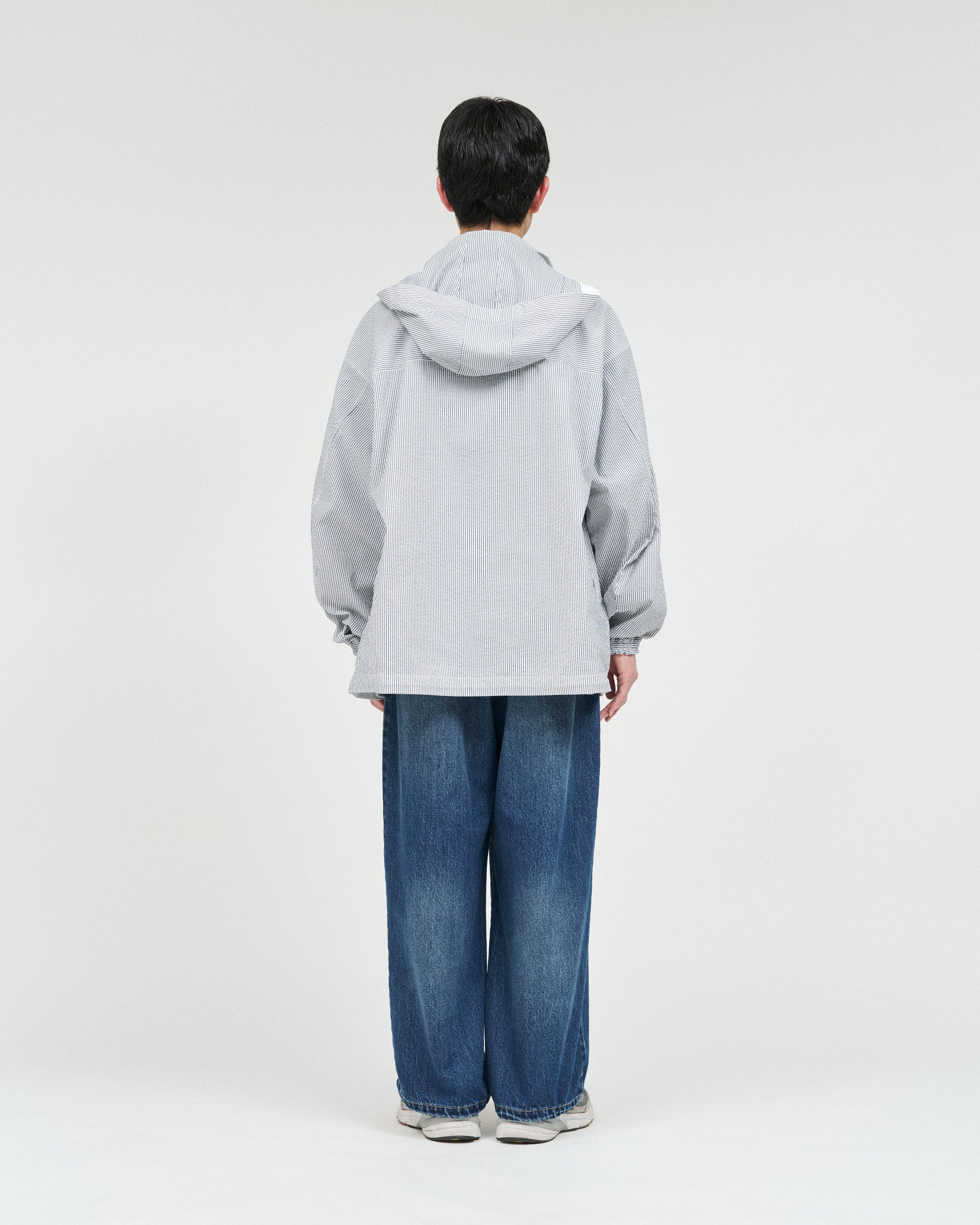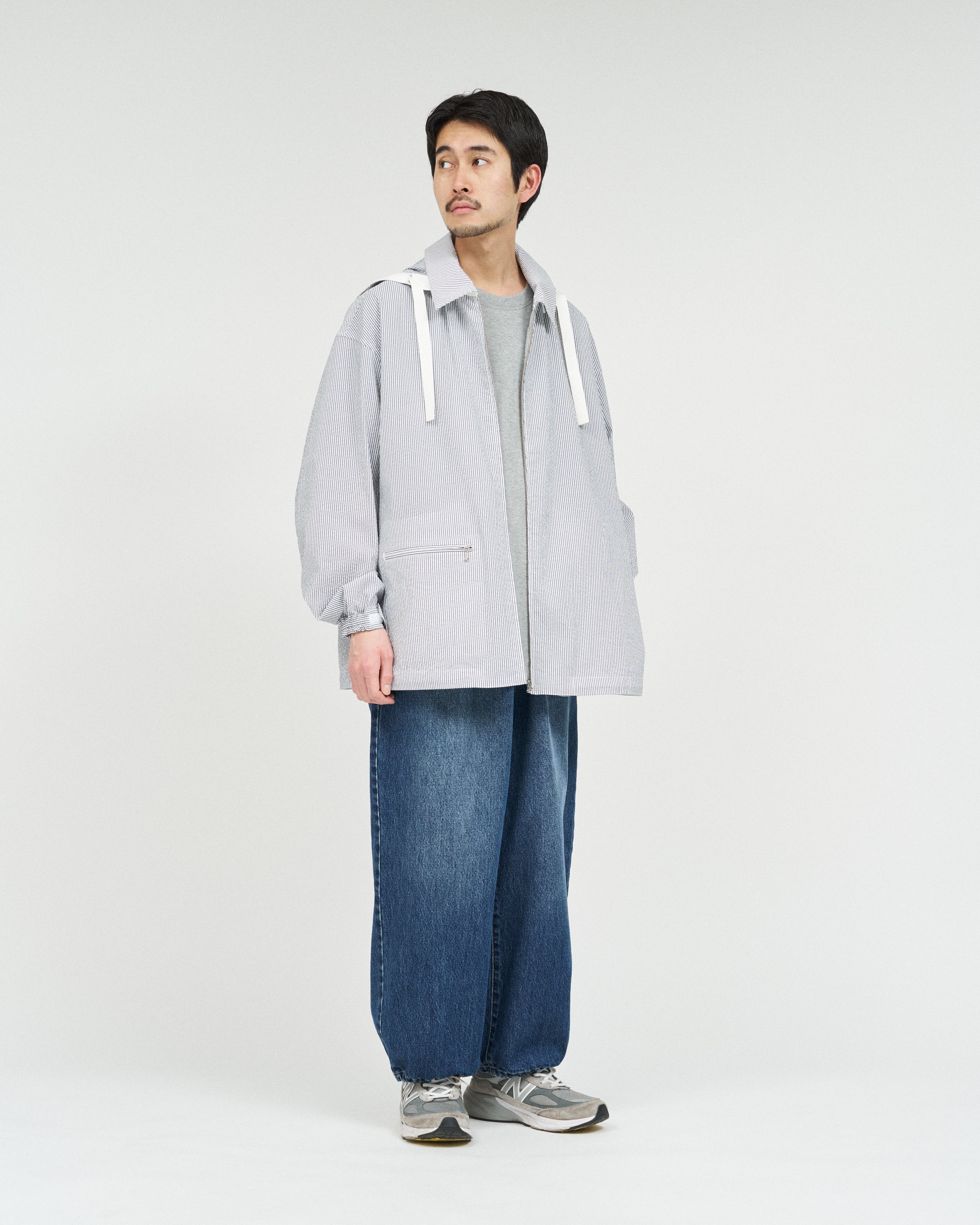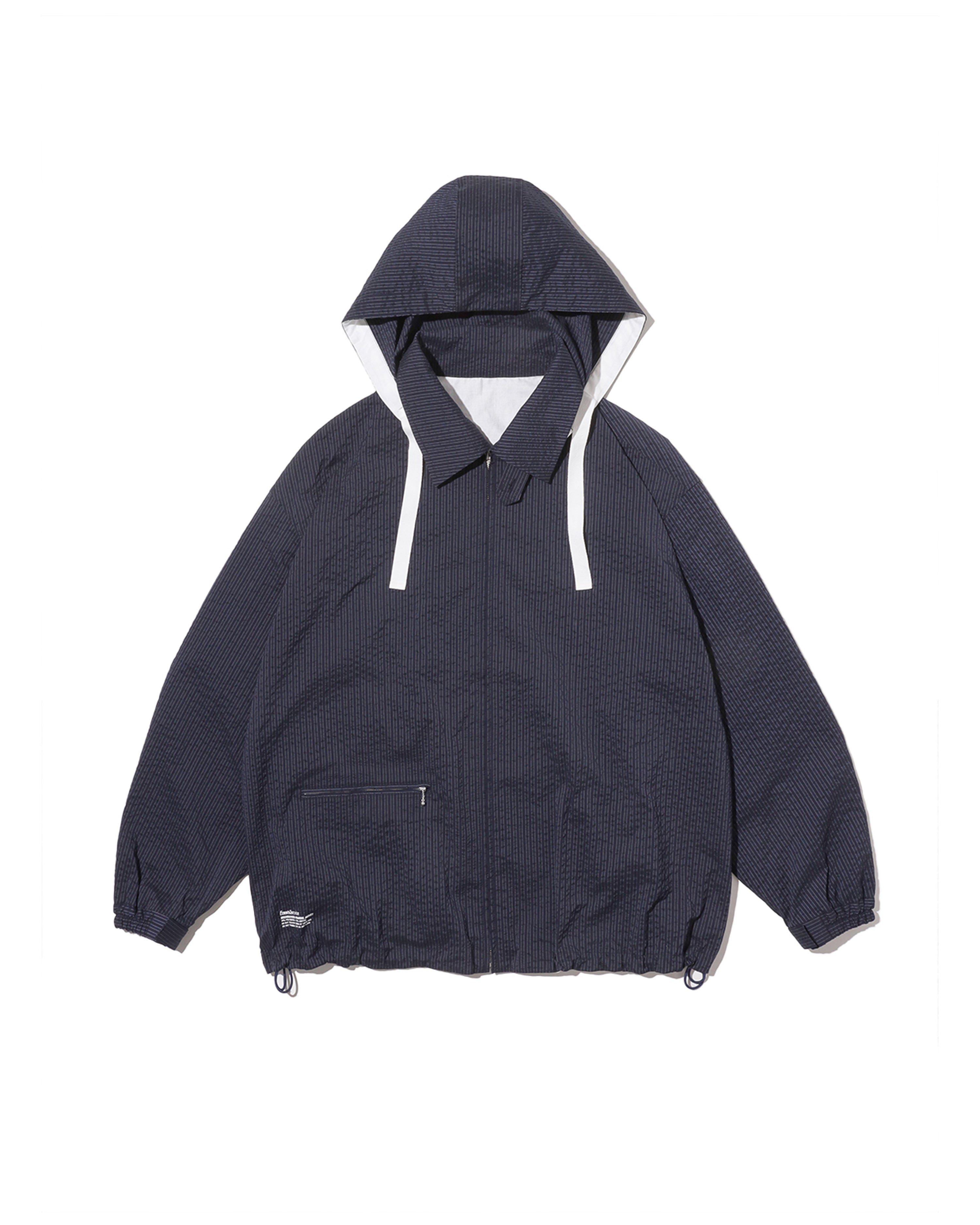 清涼感のあるシアサッカー素材を使用し、FreshServiceらしいサイジングで再構築したマリンジャケット。COOLMAX®糸を使用したシアサッカー生地は、肌離れが良く、汗ばむ季節でもドライで快適な着心地をキープします。アイビールックを彷彿とさせるストライプの表情と、現代的なオーバーサイズシルエットがバランスよく調和した一着です。フード部分は取り外し可能なので、シンブルなブルゾンとしても着用可能。上品さとラフさを併せ持ち、街でもリゾートでも軽快に羽織れる万能なアイテムです。