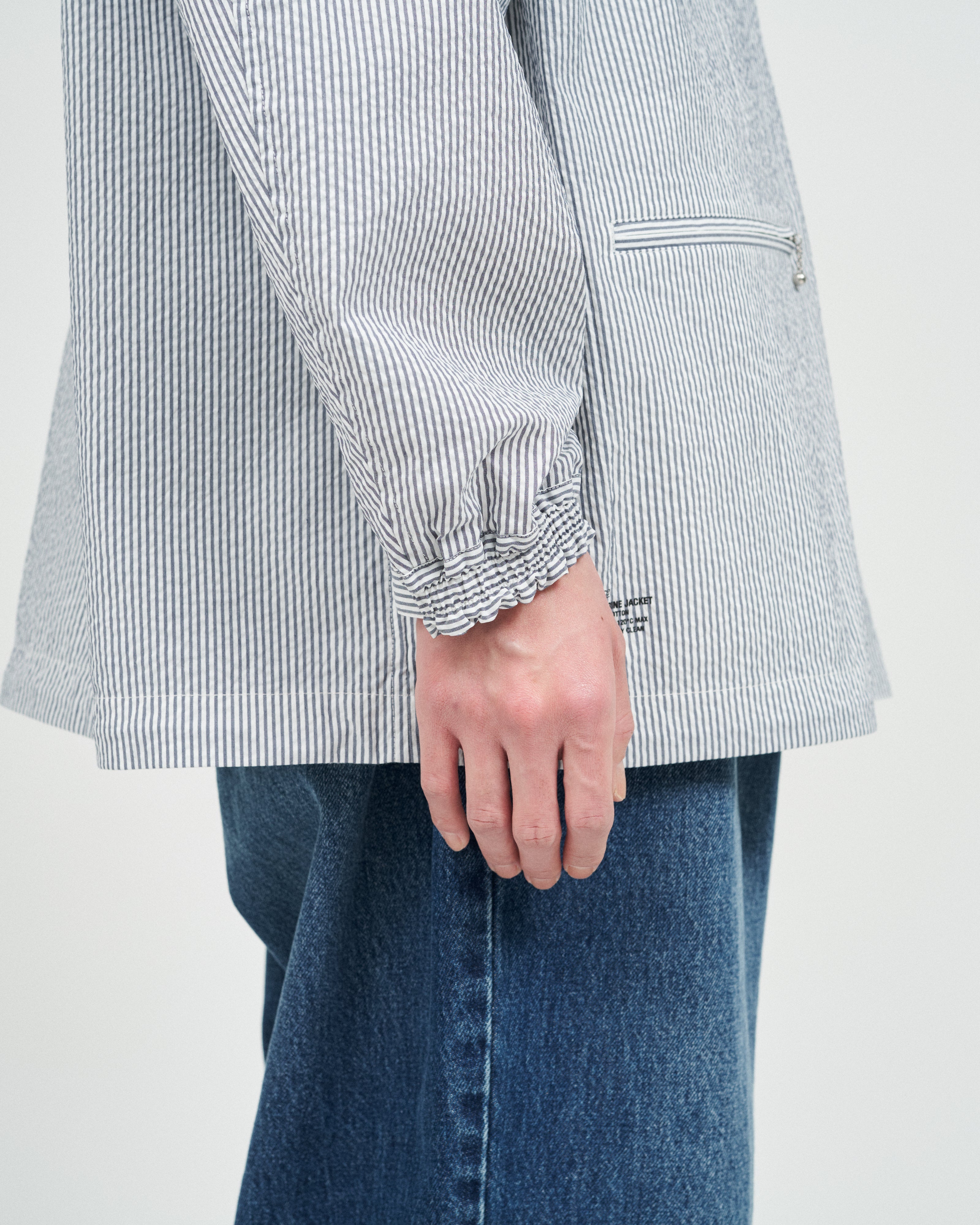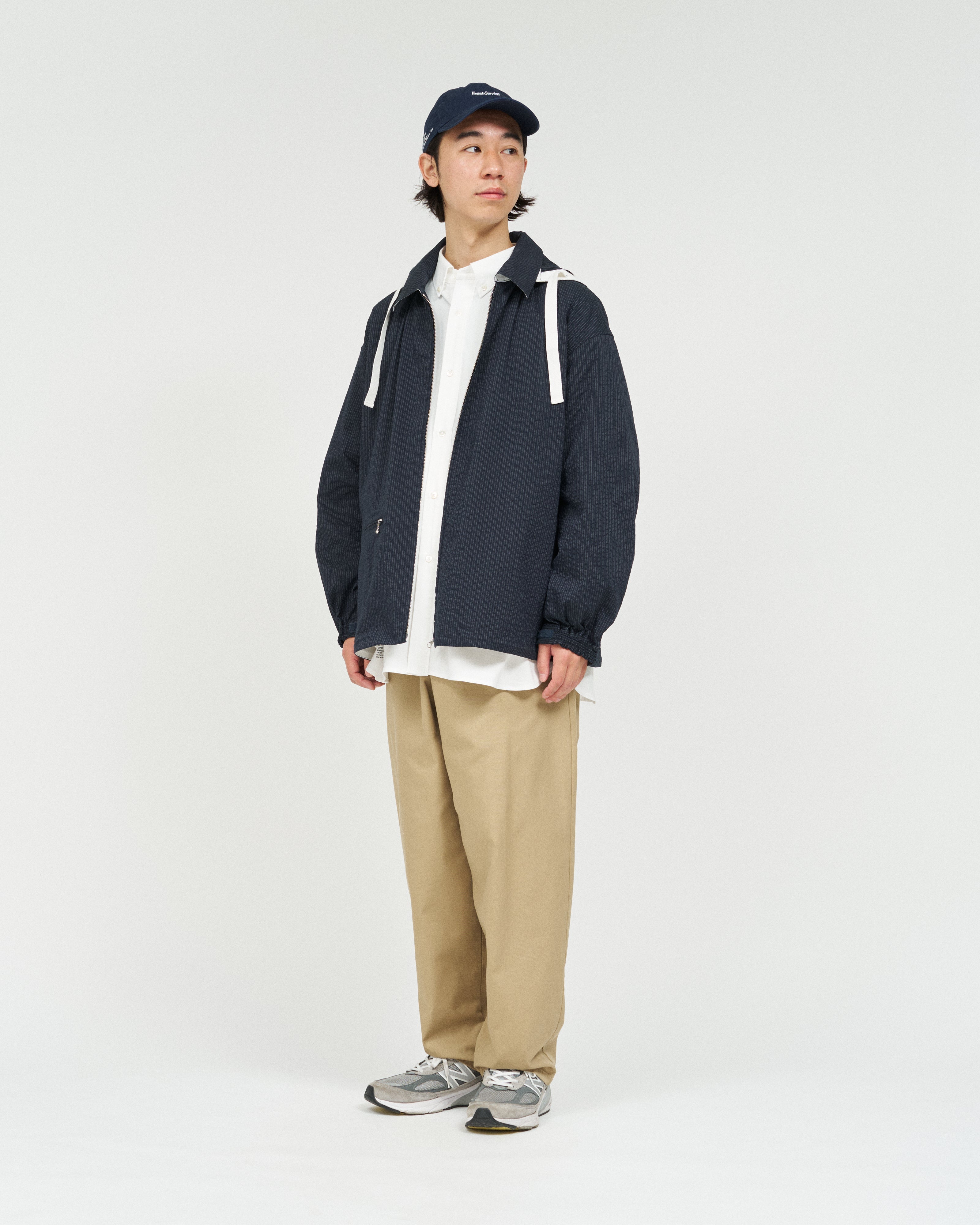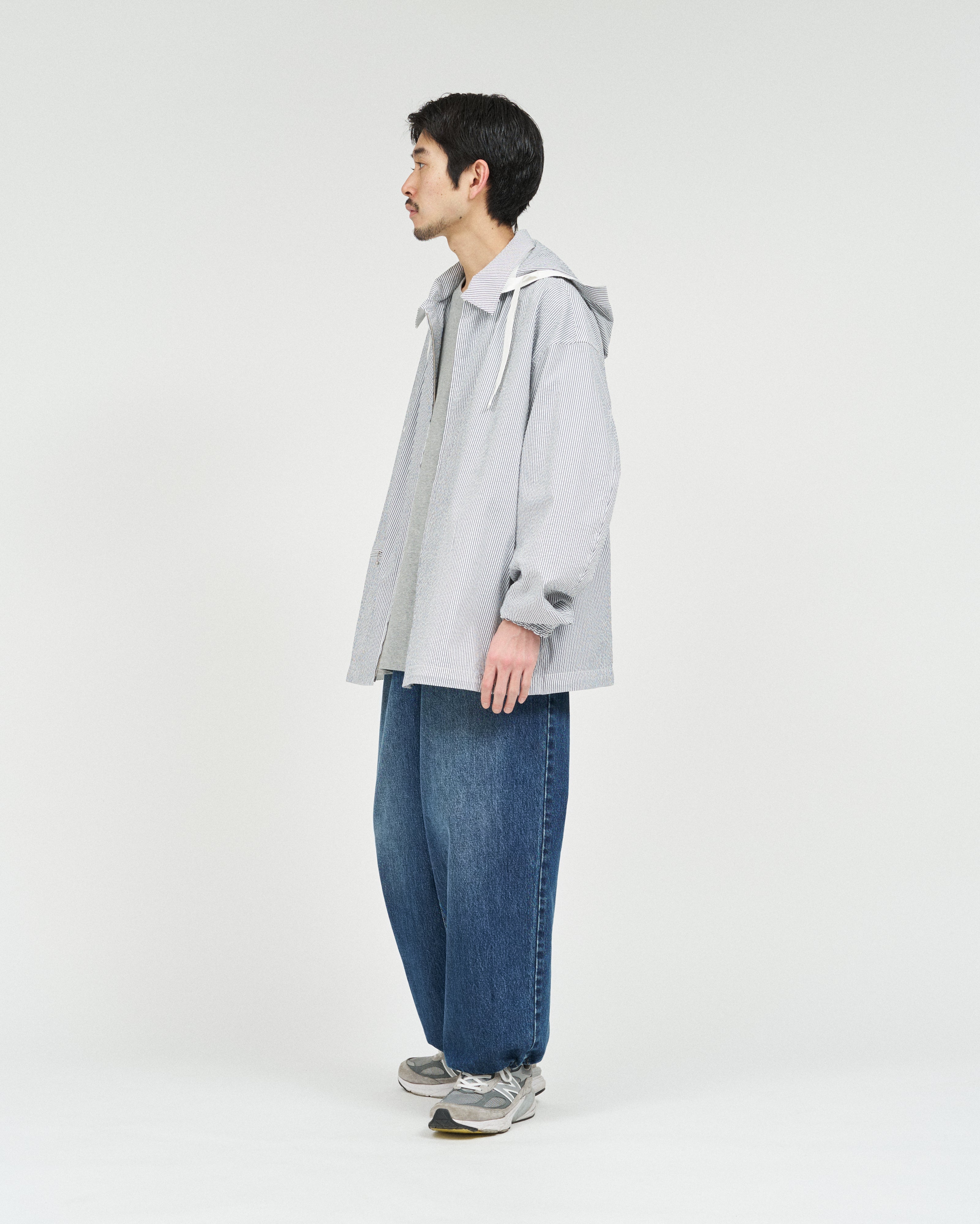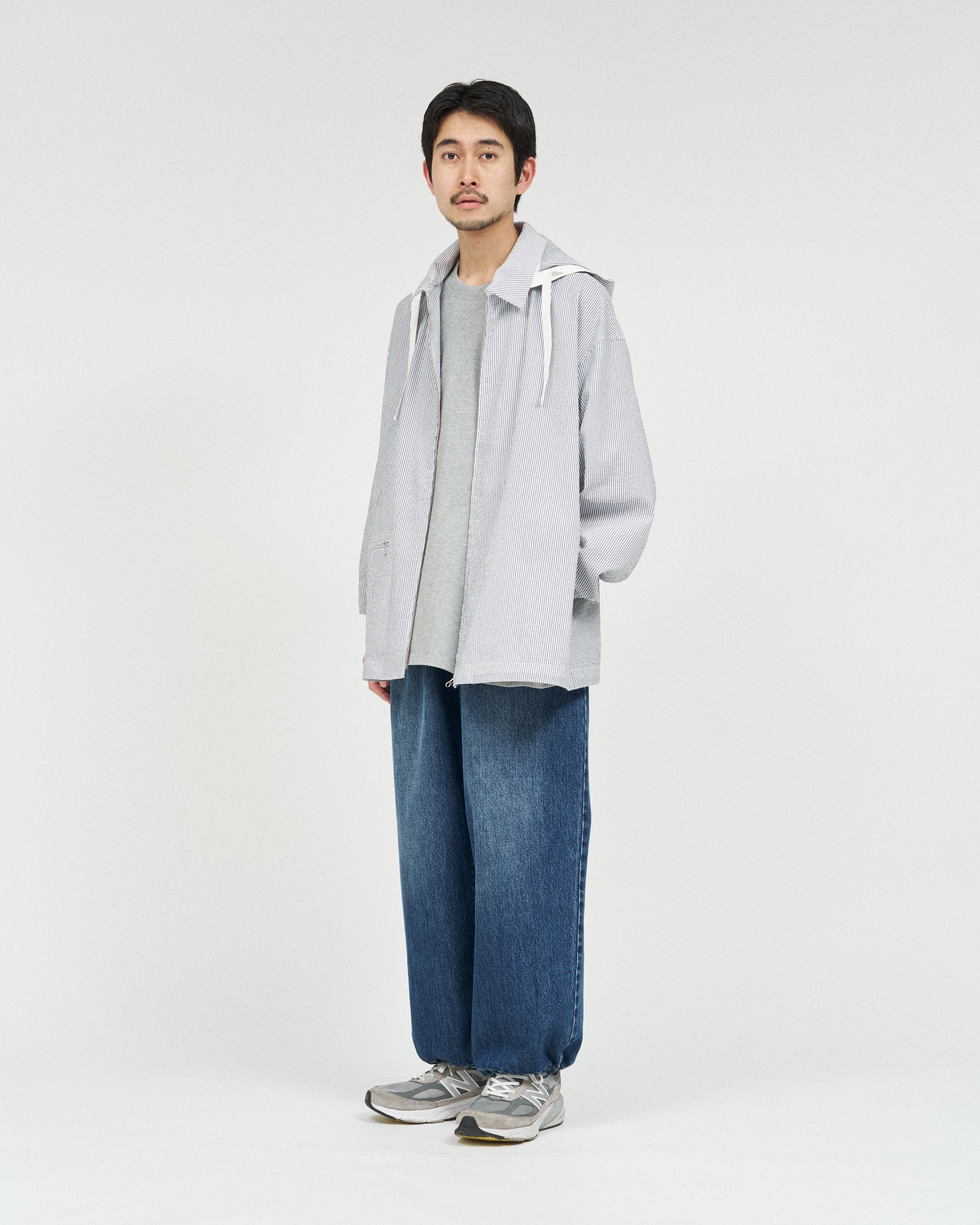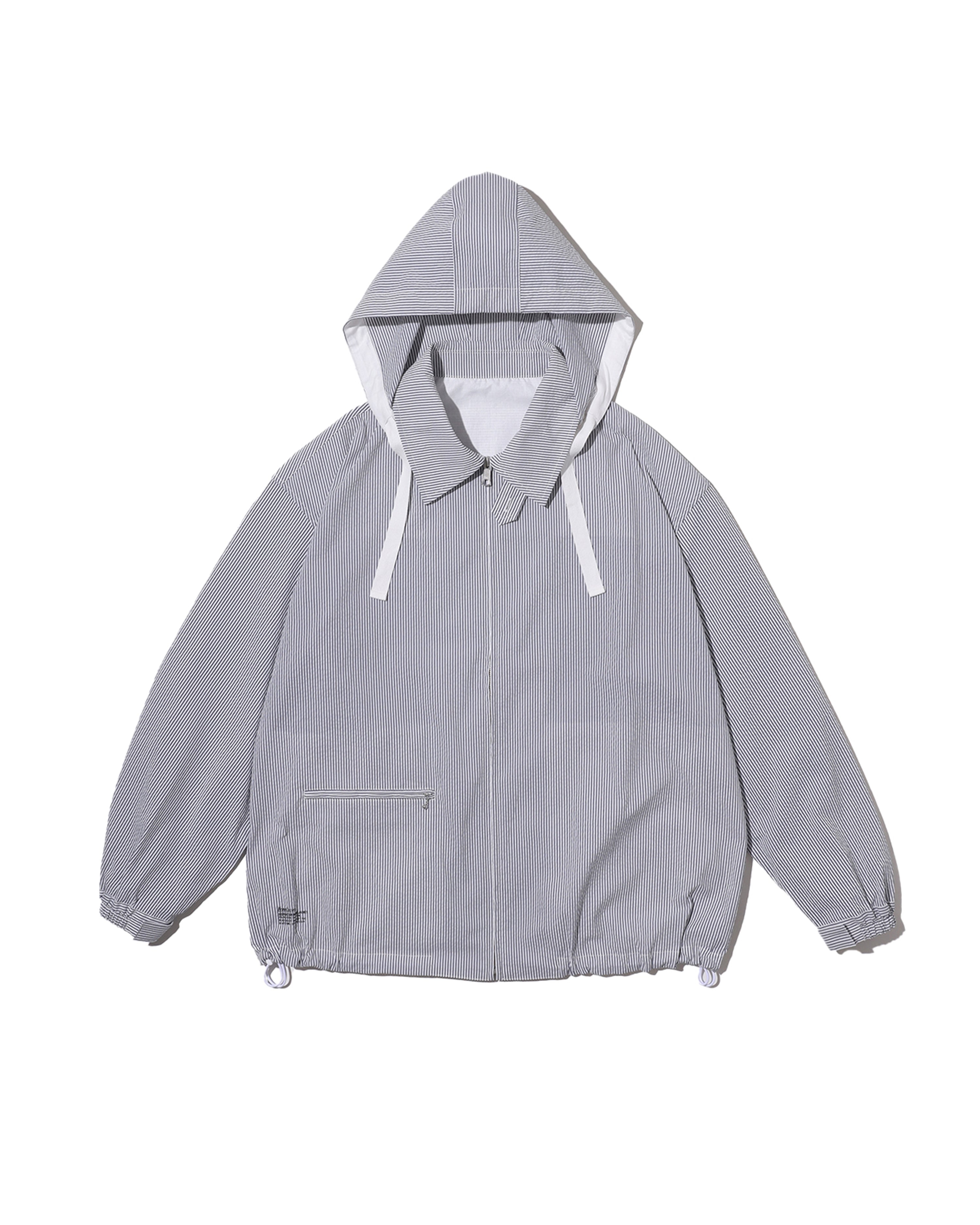清涼感のあるシアサッカー素材を使用し、FreshServiceらしいサイジングで再構築したマリンジャケット。COOLMAX®糸を使用したシアサッカー生地は、肌離れが良く、汗ばむ季節でもドライで快適な着心地をキープします。アイビールックを彷彿とさせるストライプの表情と、現代的なオーバーサイズシルエットがバランスよく調和した一着です。フード部分は取り外し可能なので、シンブルなブルゾンとしても着用可能。上品さとラフさを併せ持ち、街でもリゾートでも軽快に羽織れる万能なアイテムです。
