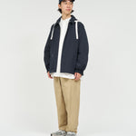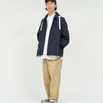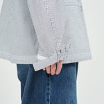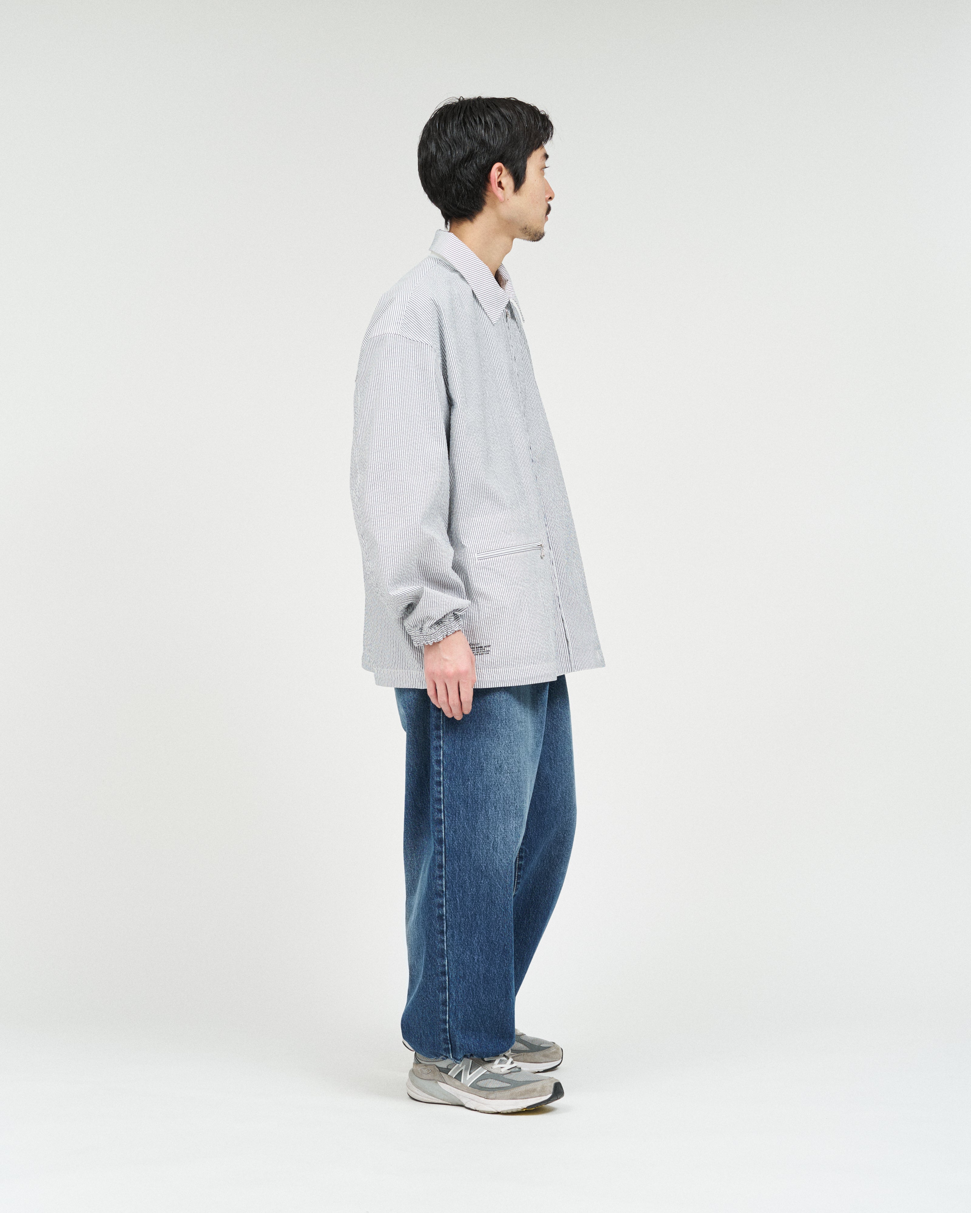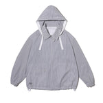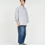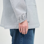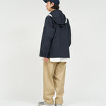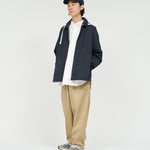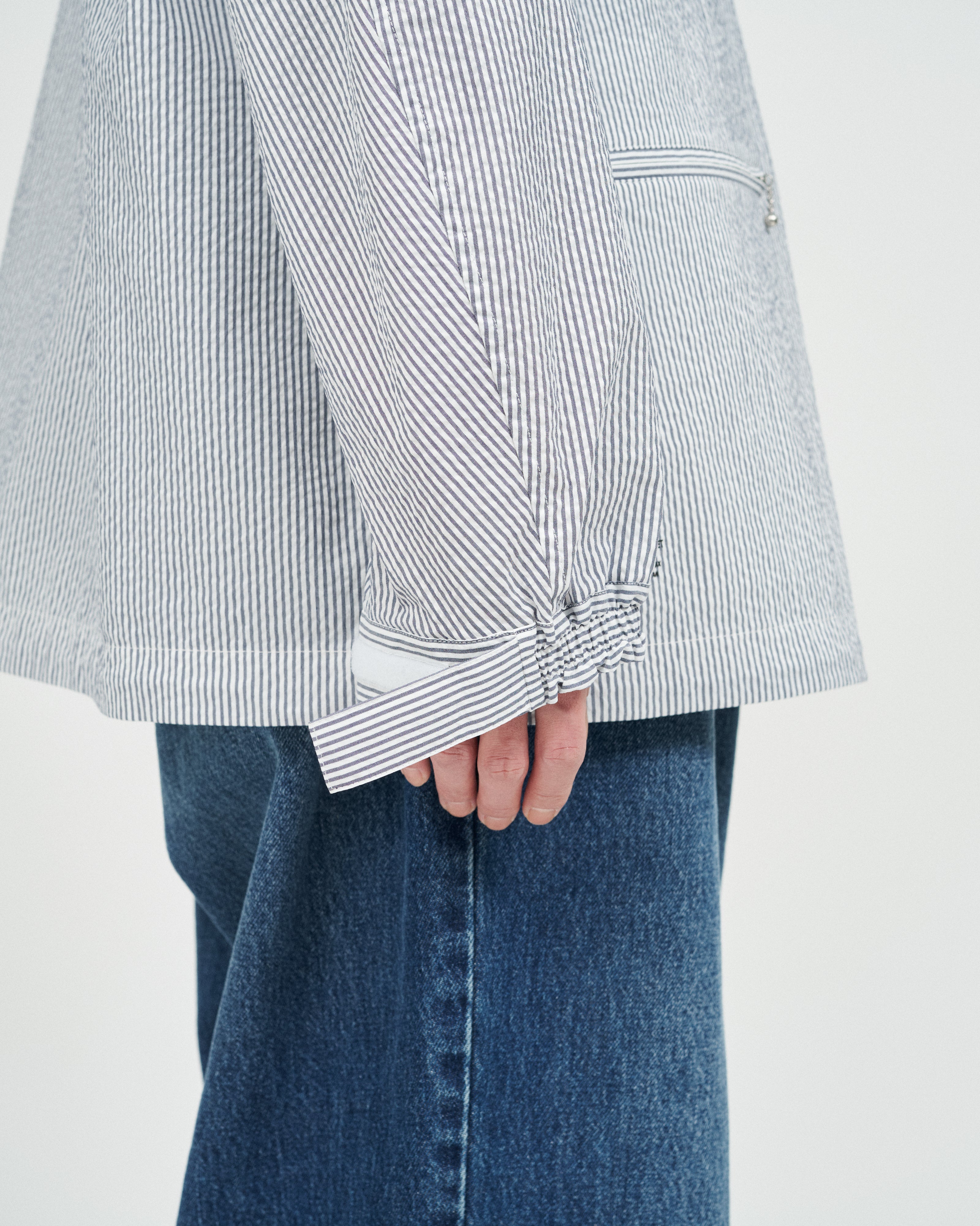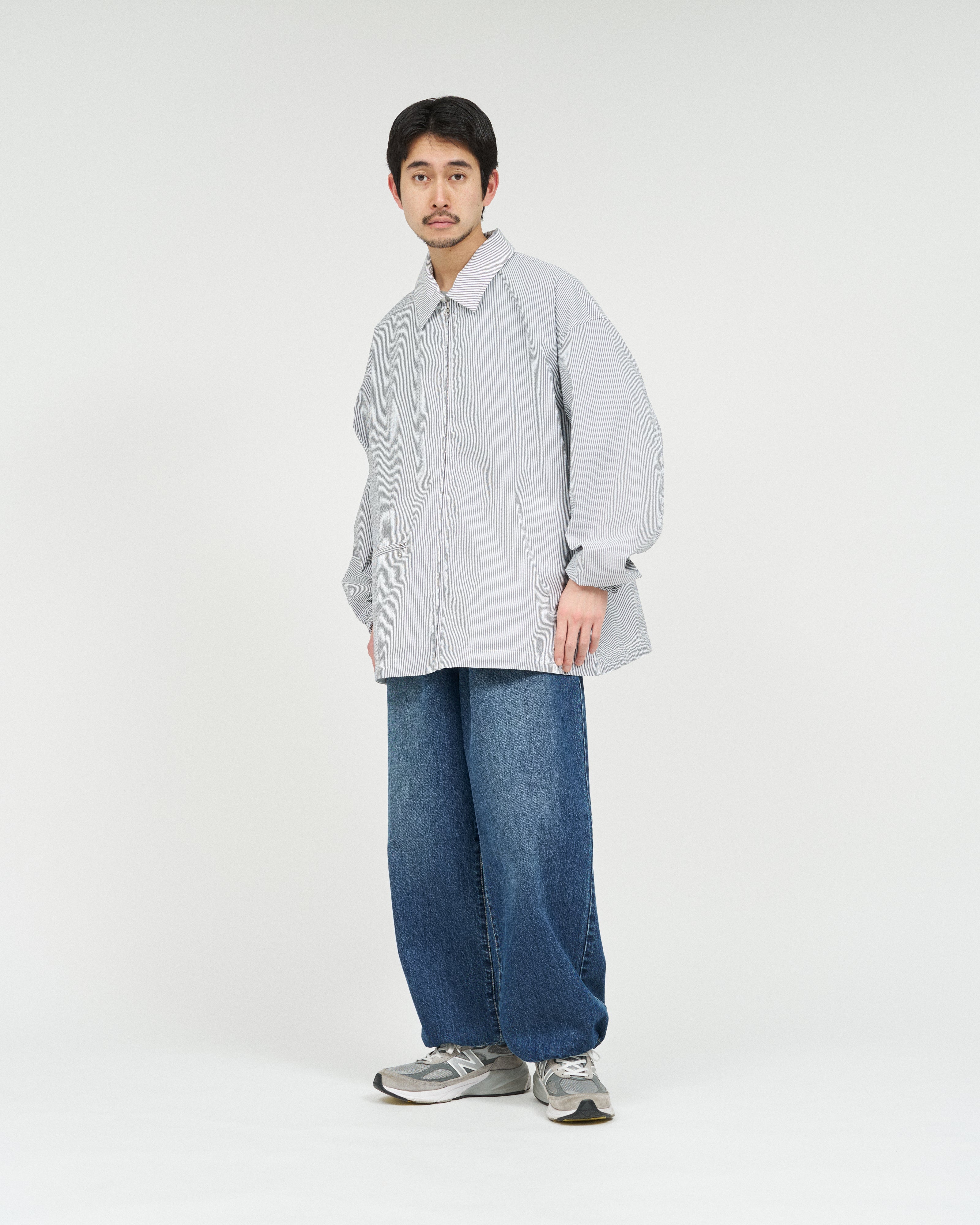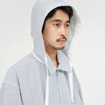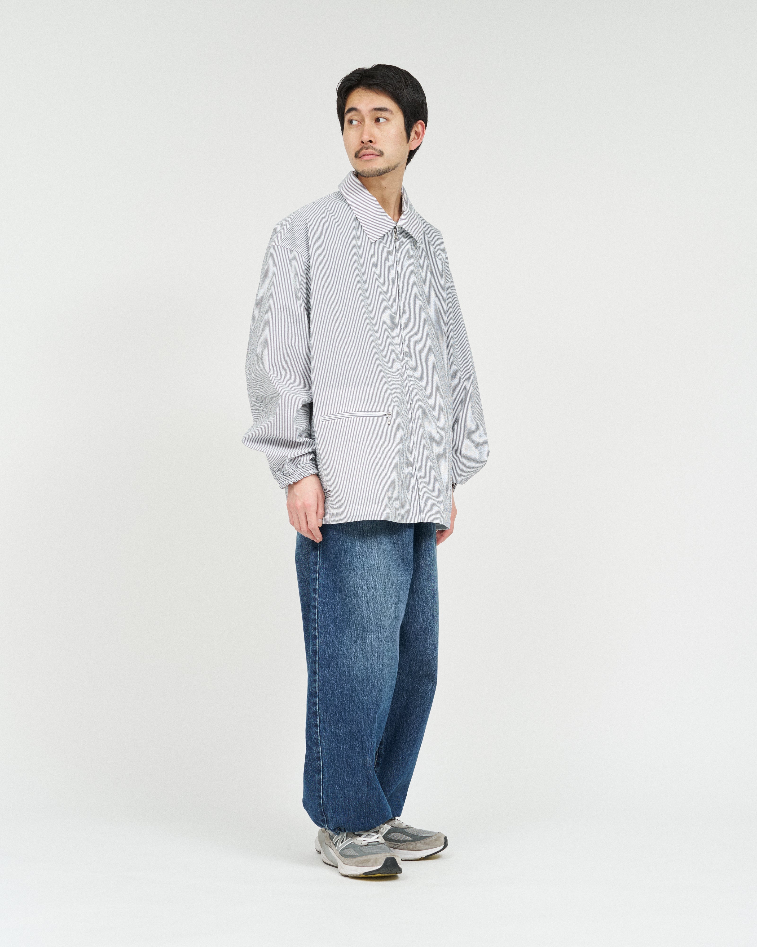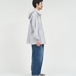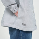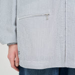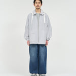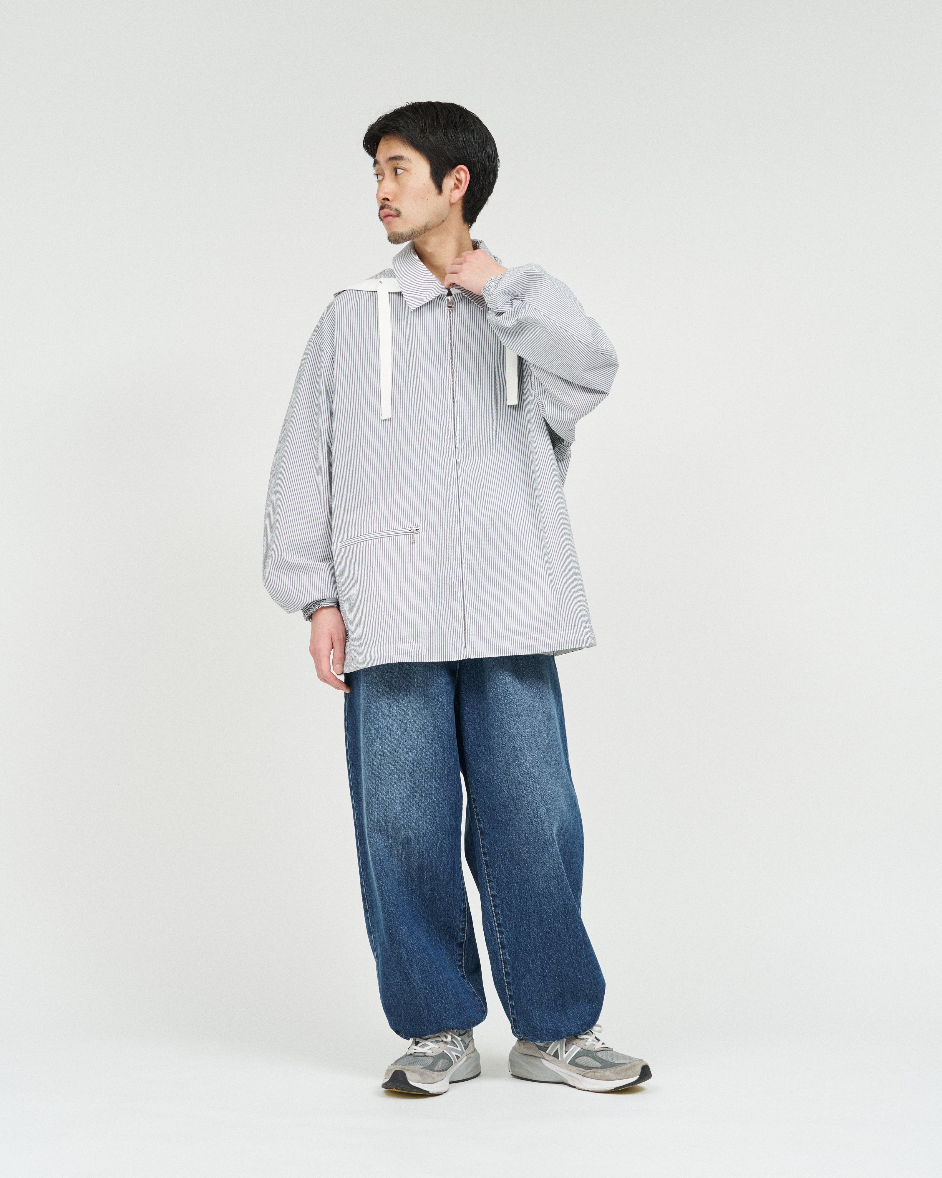 清涼感のあるシアサッカー素材を使用し、FreshServiceらしいサイジングで再構築したマリンジャケット。COOLMAX®糸を使用したシアサッカー生地は、肌離れが良く、汗ばむ季節でもドライで快適な着心地をキープします。アイビールックを彷彿とさせるストライプの表情と、現代的なオーバーサイズシルエットがバランスよく調和した一着です。フード部分は取り外し可能なので、シンブルなブルゾンとしても着用可能。上品さとラフさを併せ持ち、街でもリゾートでも軽快に羽織れる万能なアイテムです。
