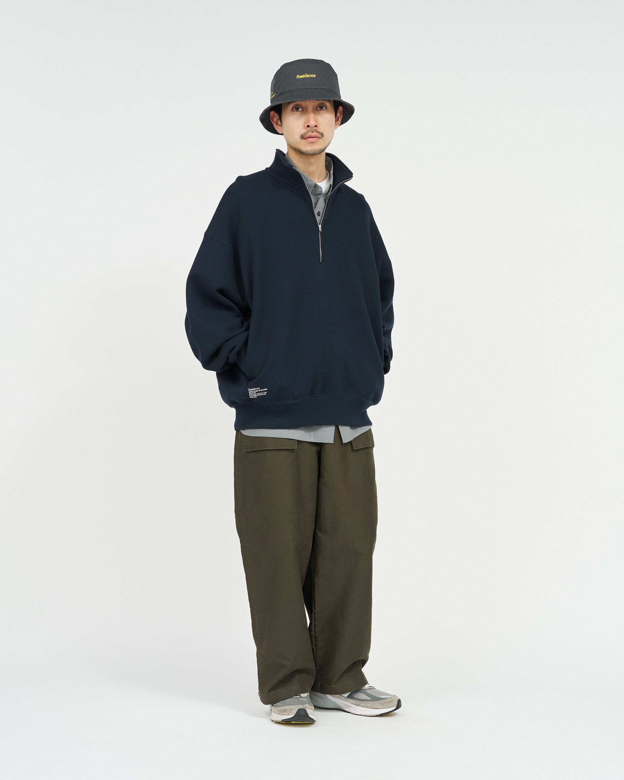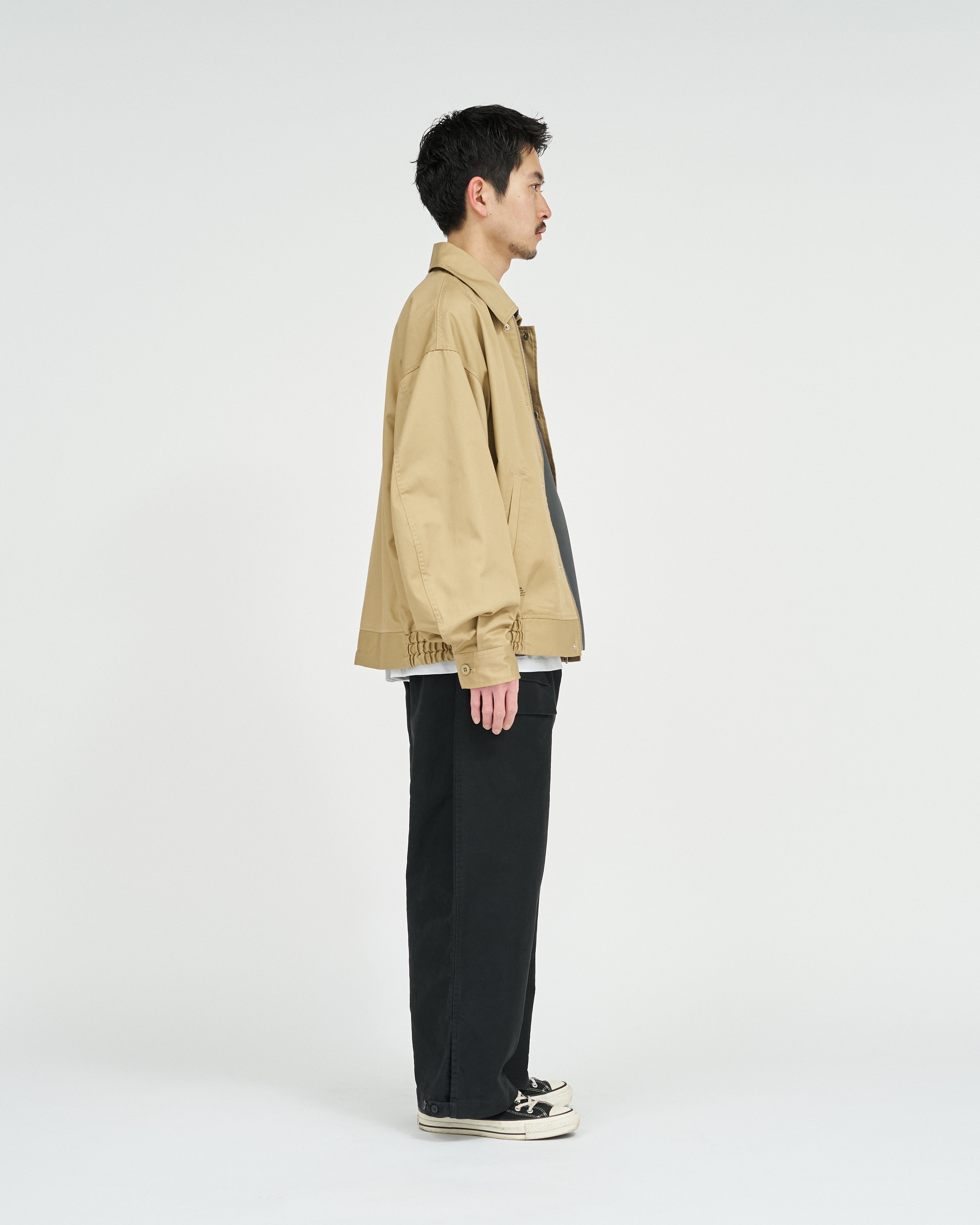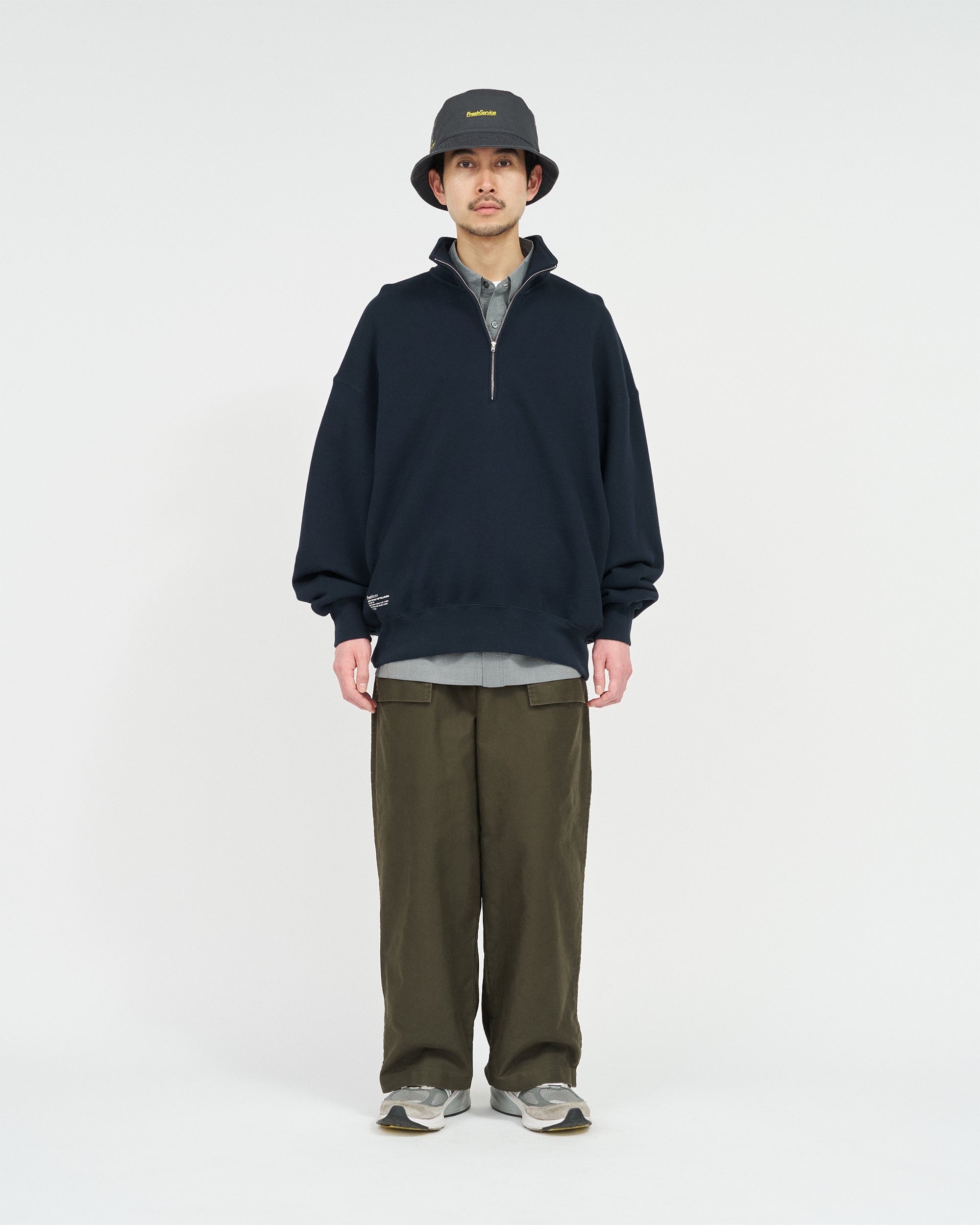 往年のタンカースパンツがデザインソース。オリジナルのディテールを忠実に再現にしながらも一枚でも存在感のある一着に。FreshServieらしくゆったりしたサイジングでモダナイズ。無骨なミリタリーファブリックに、長年着込んだようなフェード感を加えることで、深みのある表情に。