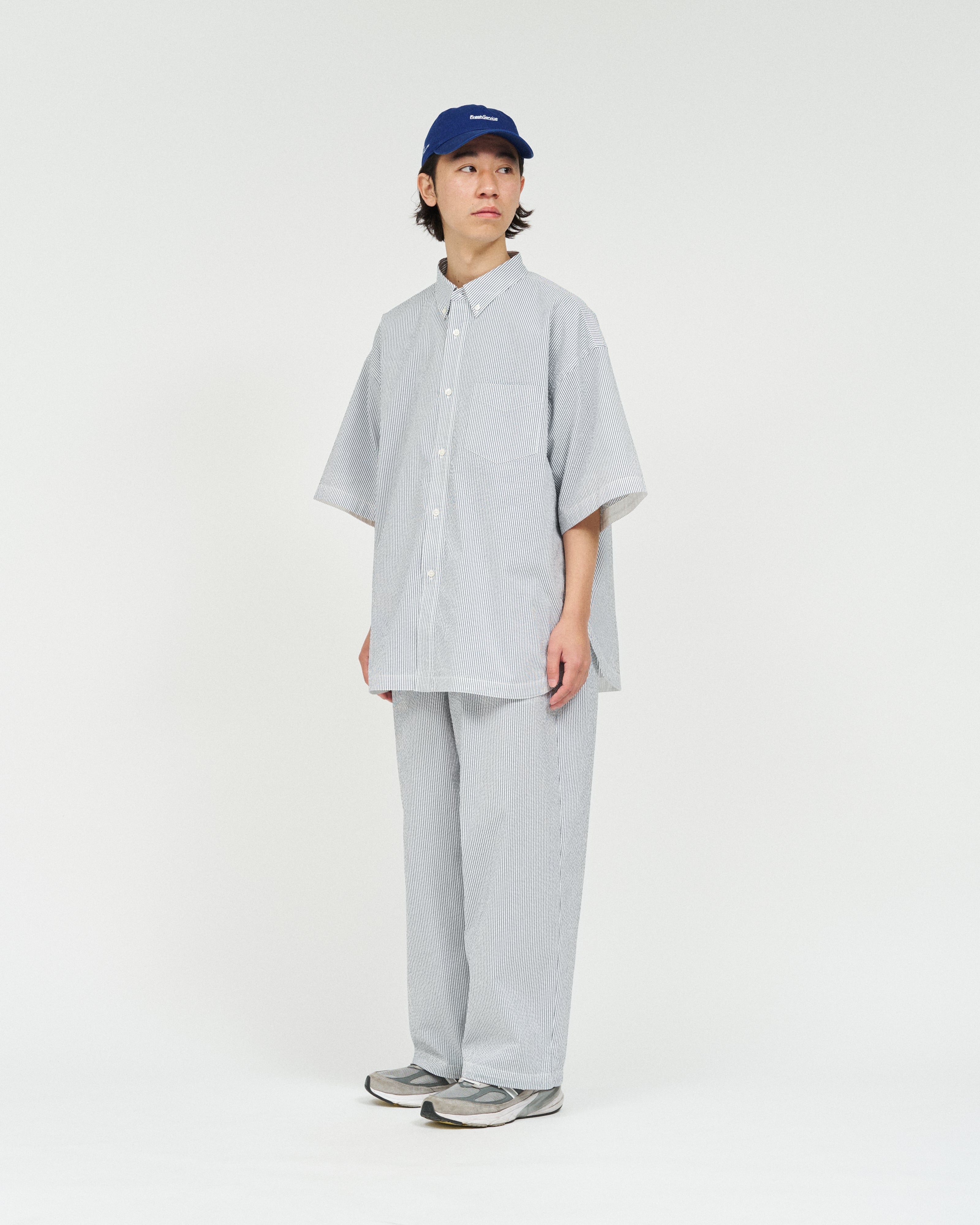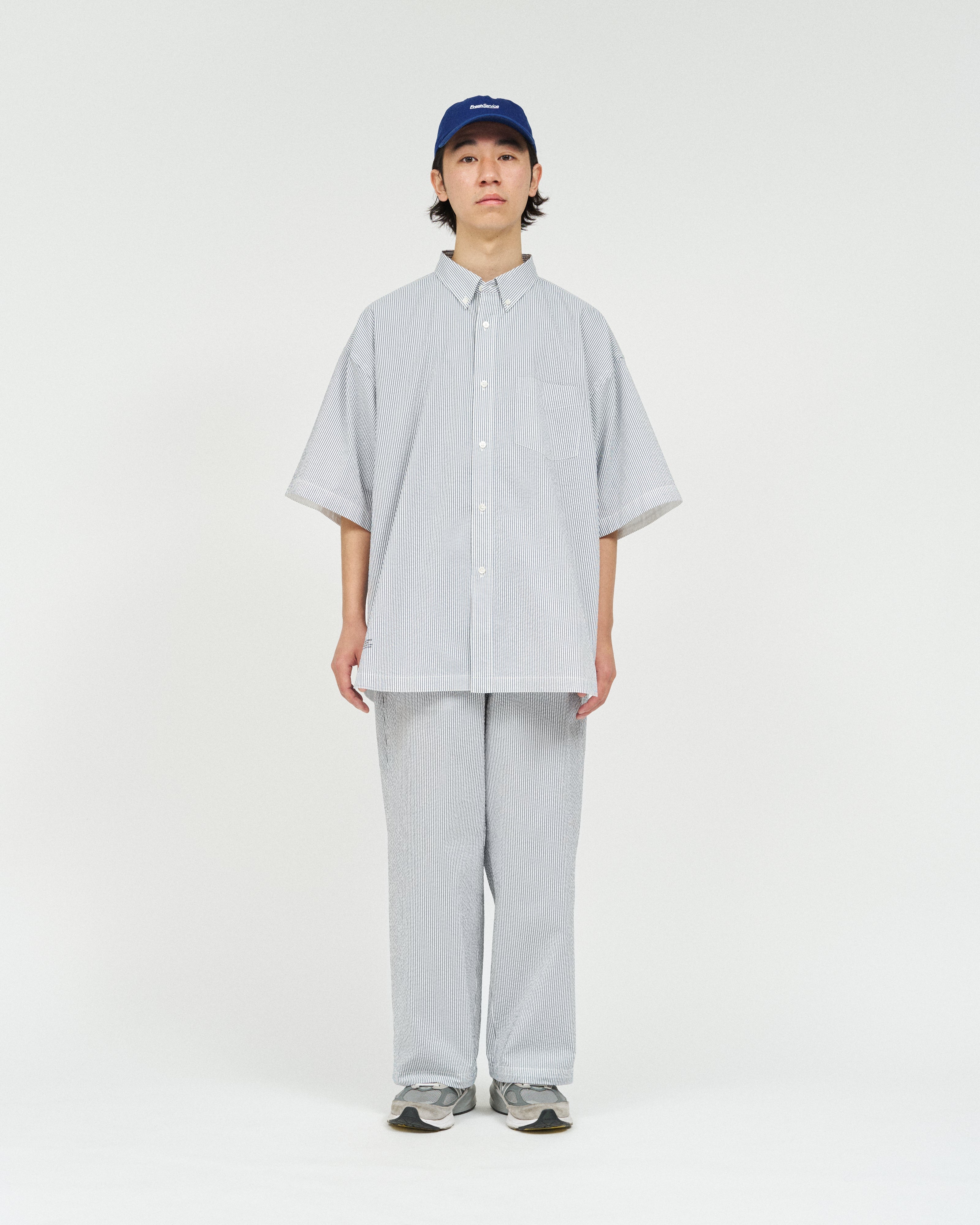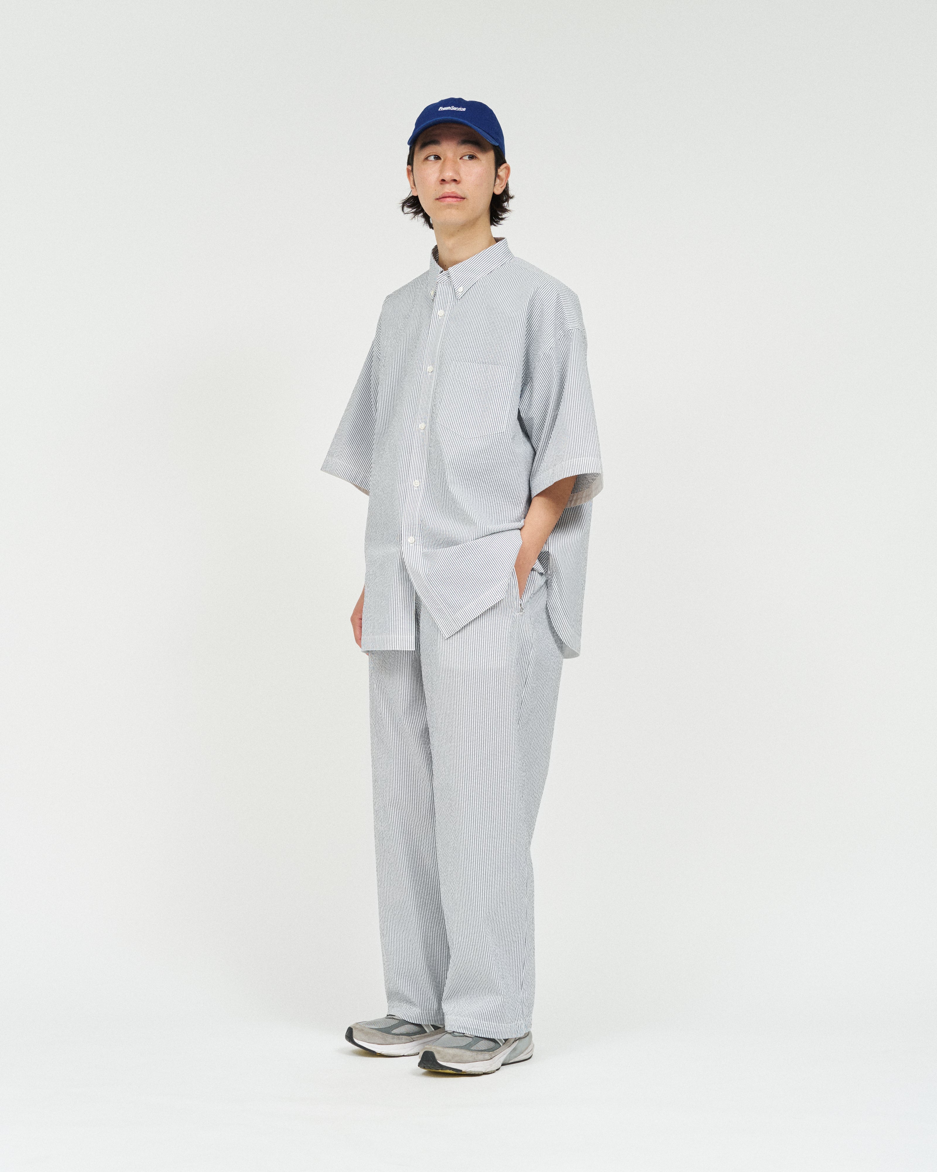 同素材の“SEERSUCKER MARINE JACKET”や"SEERSUCKER S/S B.D SHIRT”とのセットアップでの着用もおすすめ。
